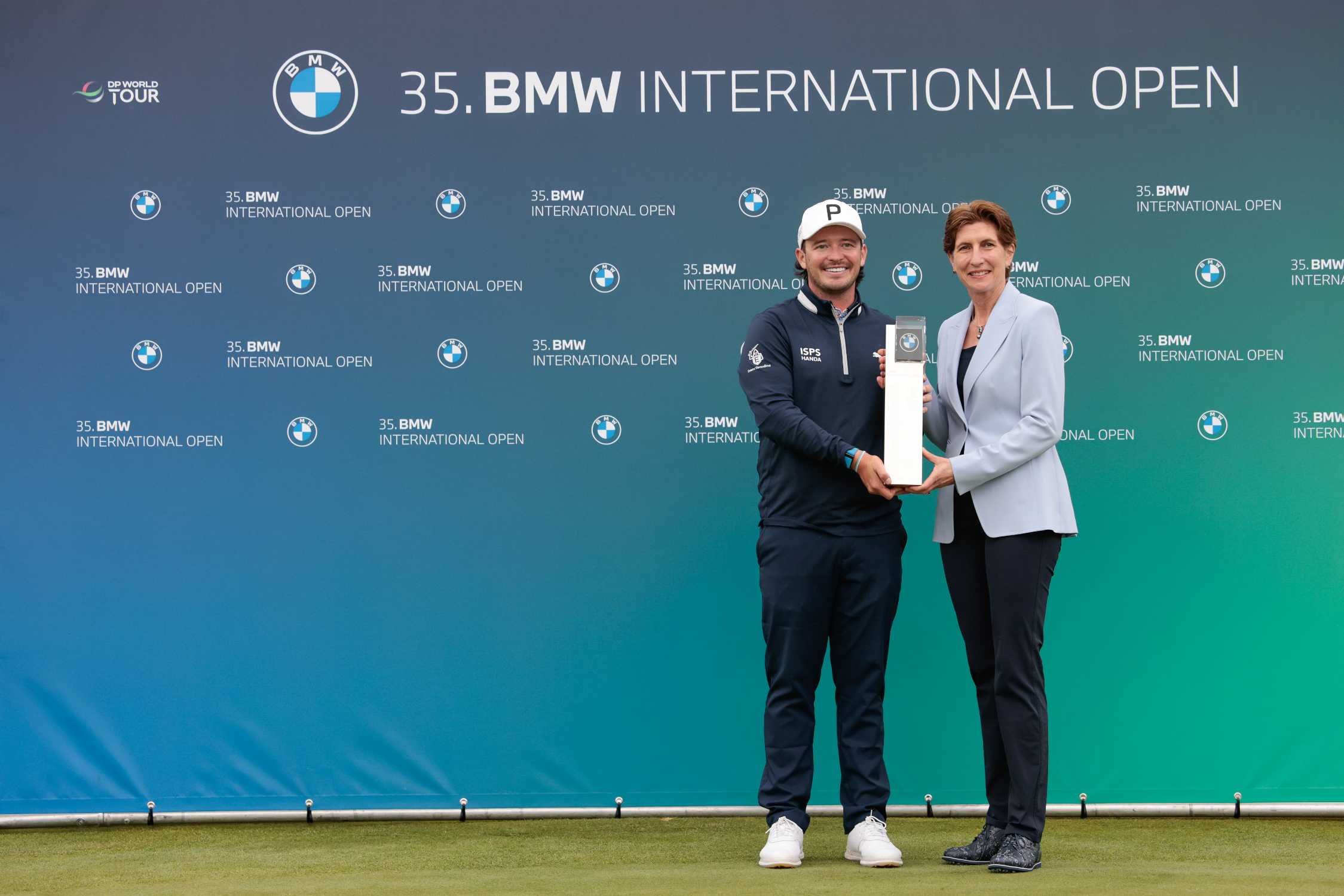 07. Juli 2024, BMW International Open, Ewen Ferguson, Gewinner der 35. BMW International Open, Ilka Horstmeier (Personal- und Immobilienvorständin der BMW Group)