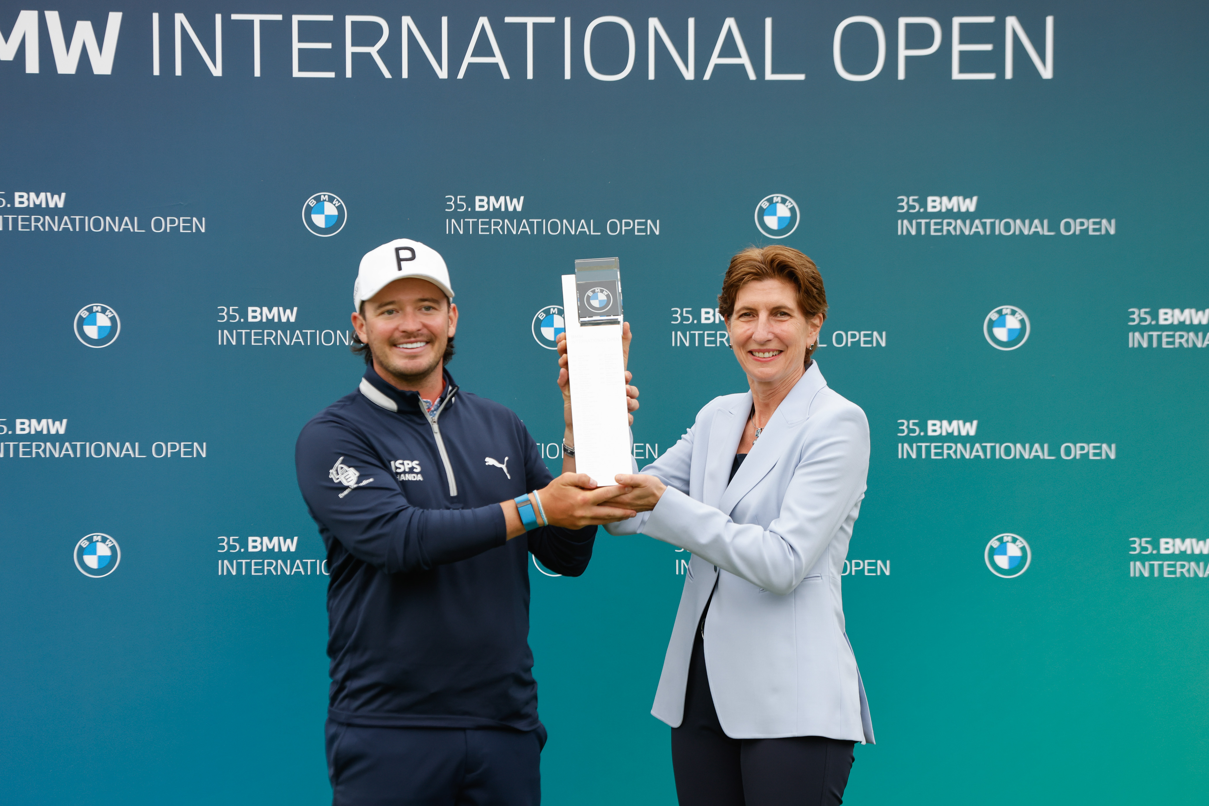 07. Juli 2024, BMW International Open, Ewen Ferguson, Gewinner der 35. BMW International Open, Ilka Horstmeier (Personal- und Immobilienvorständin der BMW Group)