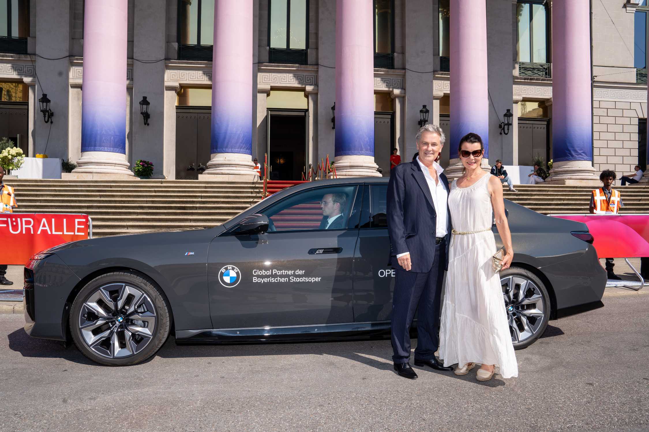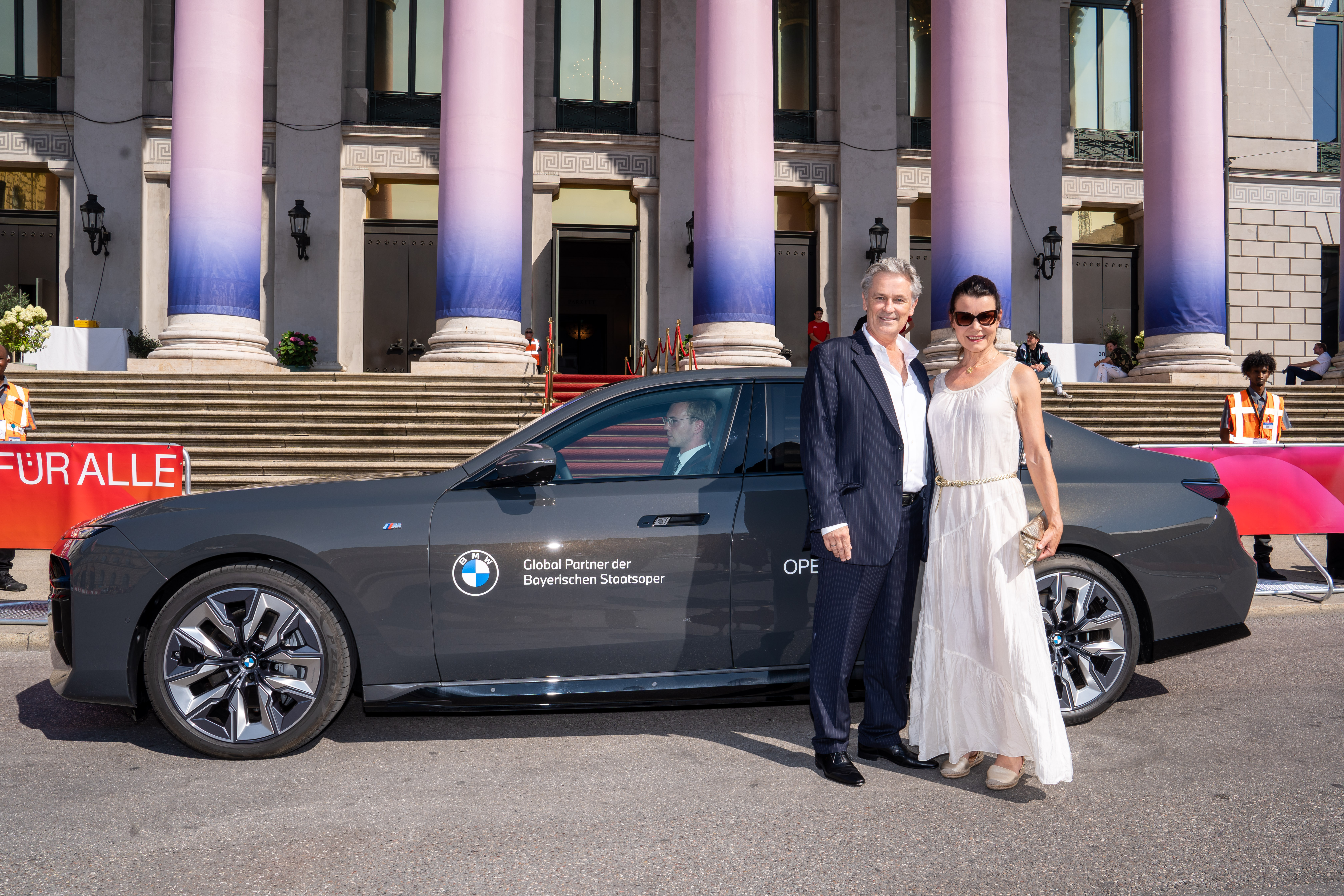 BMW und die Bayerische Staatsoper laden ein zu Oper für alle 2024 am 27. Juli auf dem Max-Joseph-Platz in München. Timothy Peach (britisch-deutscher Schauspieler) und Ehefrau Nicola Tiggeler (Schauspielerin). Foto: ProjectImages / Gerald Matzka © BMW AG (07/2024)