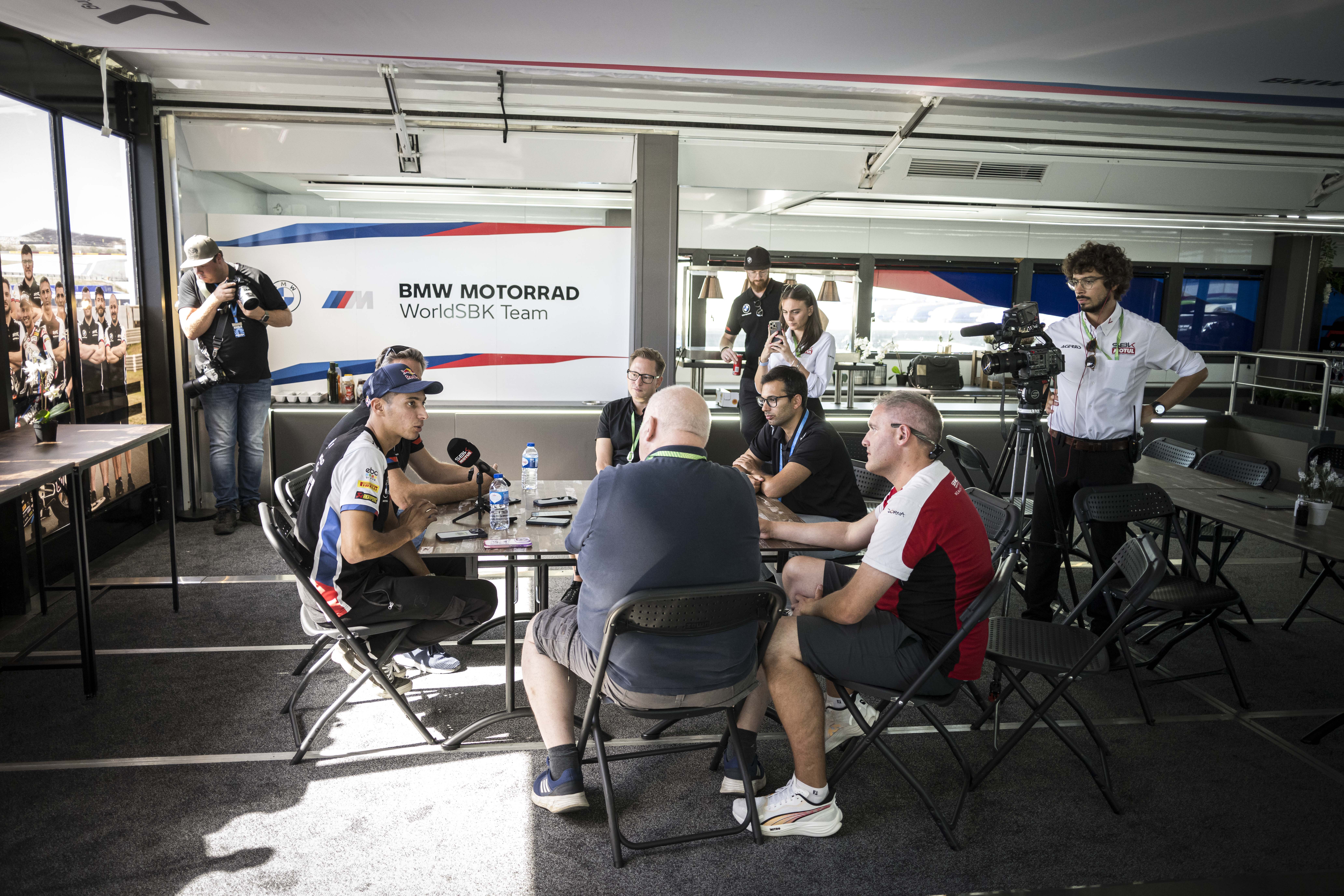 26th September 2024. Aragon (SPA). FIM Superbike World Championship ROKiT BMW Motorrad WorldSBK Team, BMW M 1000 RR, Toprak Razgatlıoğlu #54 (TUR) with Marc Bongers, BMW Motorrad Motorsport Sporting Director.