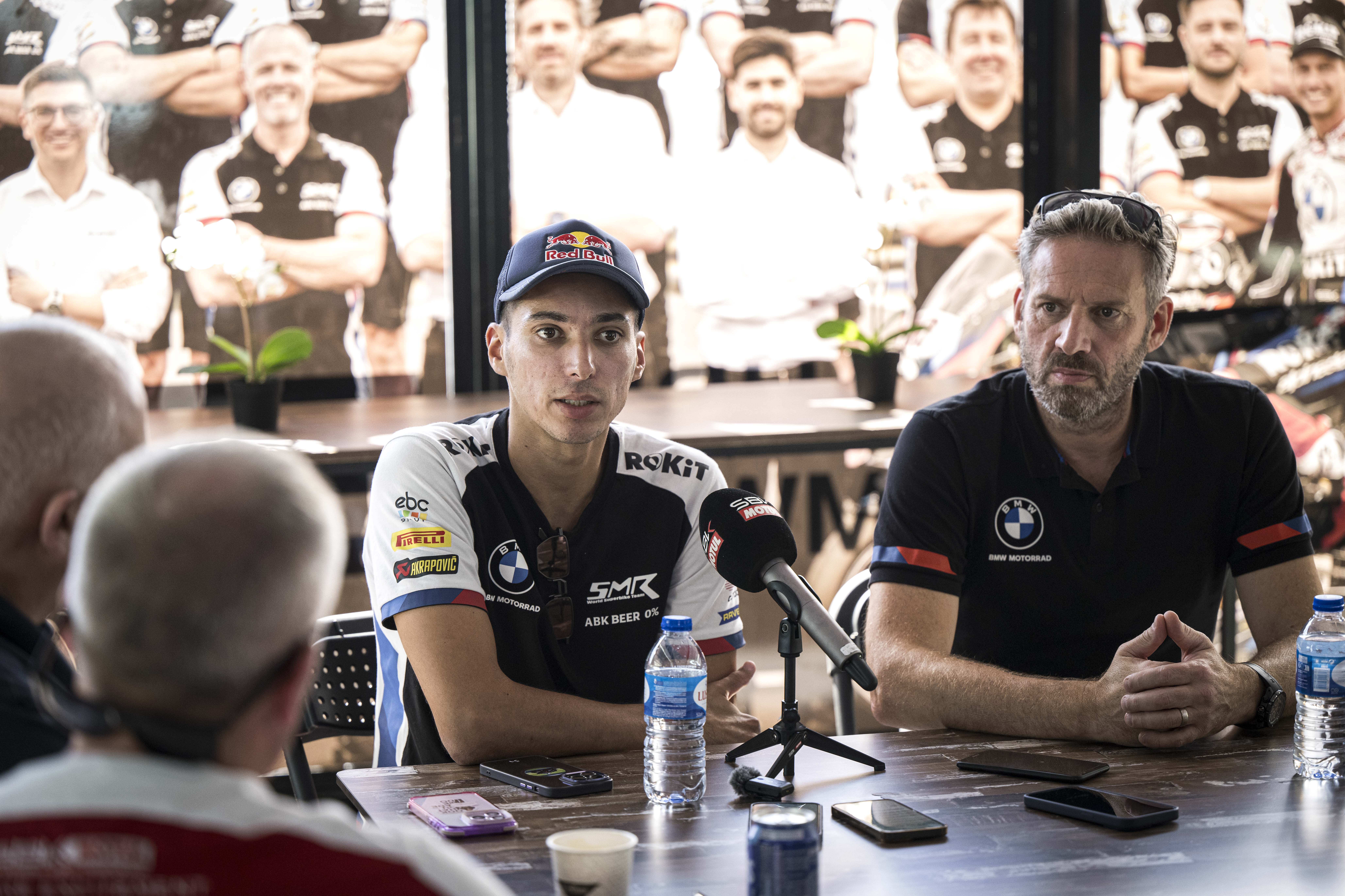 26th September 2024. Aragon (SPA). FIM Superbike World Championship ROKiT BMW Motorrad WorldSBK Team, BMW M 1000 RR, Toprak Razgatlıoğlu #54 (TUR) with Marc Bongers, BMW Motorrad Motorsport Sporting Director.