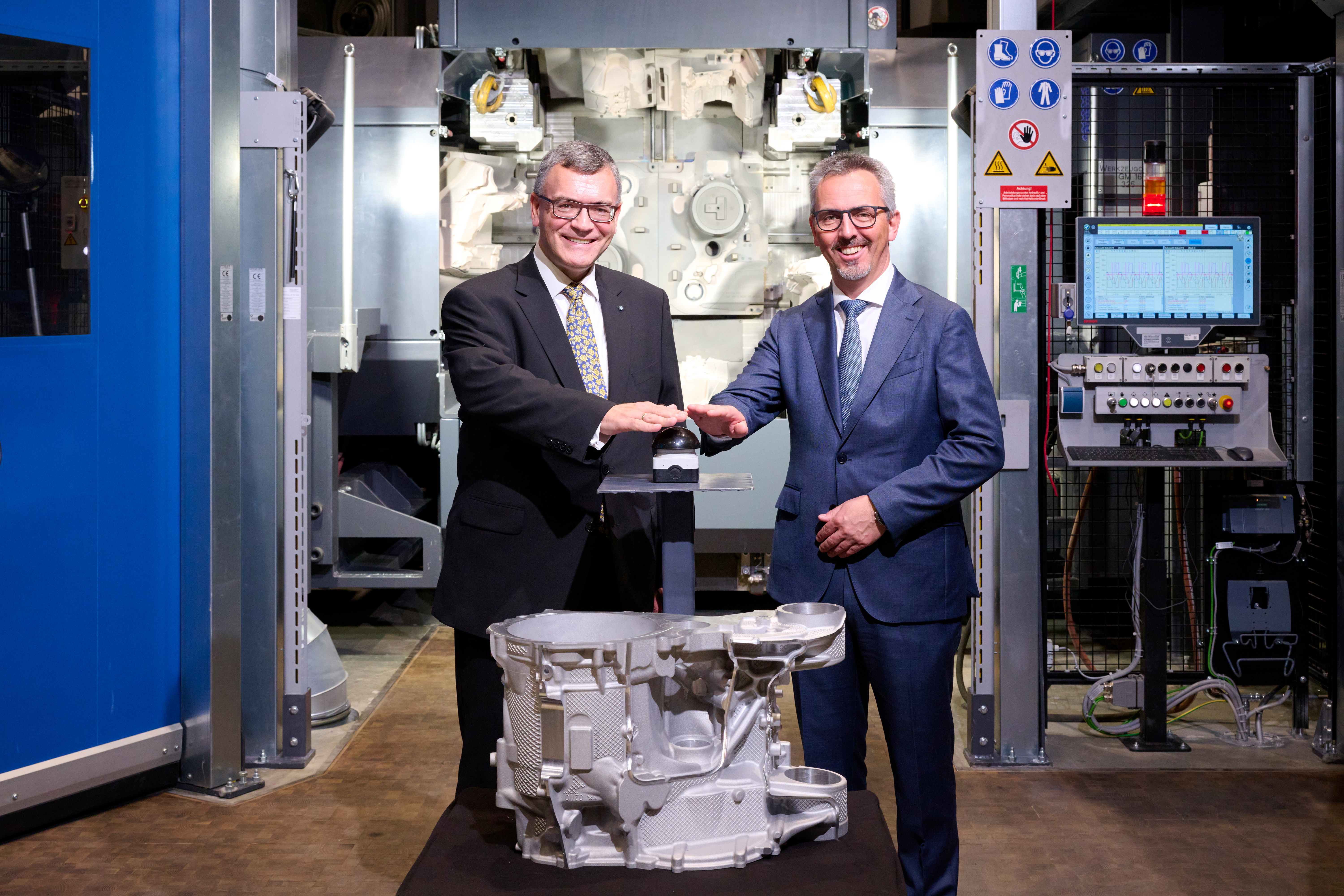 Dr. Joachim Post, Mitglied des Vorstands der BMW AG, Einkauf und Lieferantennetzwerk, und Staatsminister Dr. Florian Herrmann, Leiter der Bayerischen Staatskanzlei, starten die Vorserienproduktion der Neue Klasse E-Motorengehäuse im BMW Group Werk Landshut (10/2024)