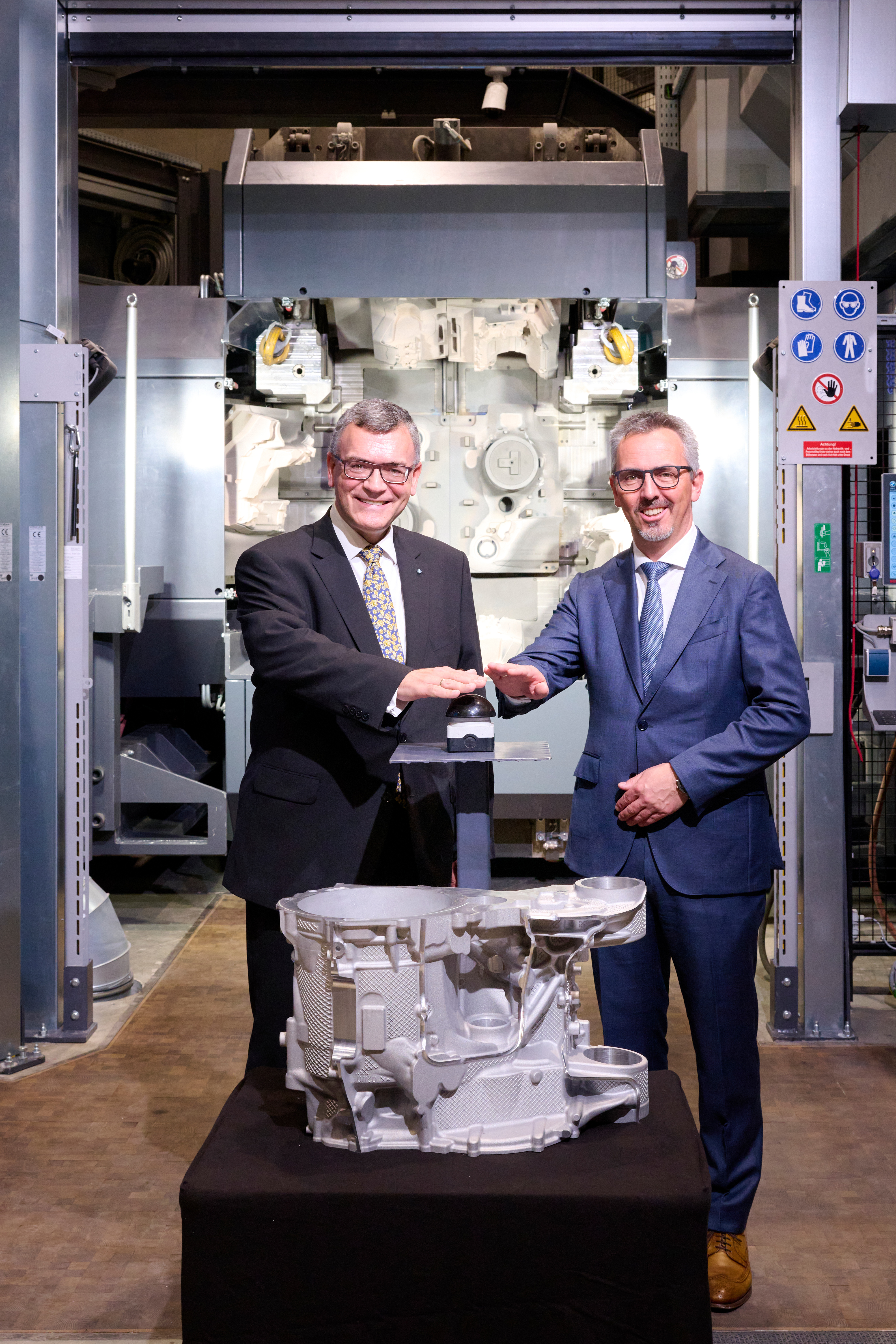 Dr. Joachim Post, Mitglied des Vorstands der BMW AG, Einkauf und Lieferantennetzwerk, und Staatsminister Dr. Florian Herrmann, Leiter der Bayerischen Staatskanzlei, starten die Vorserienproduktion der Neue Klasse E-Motorengehäuse im BMW Group Werk Landshut (10/2024)