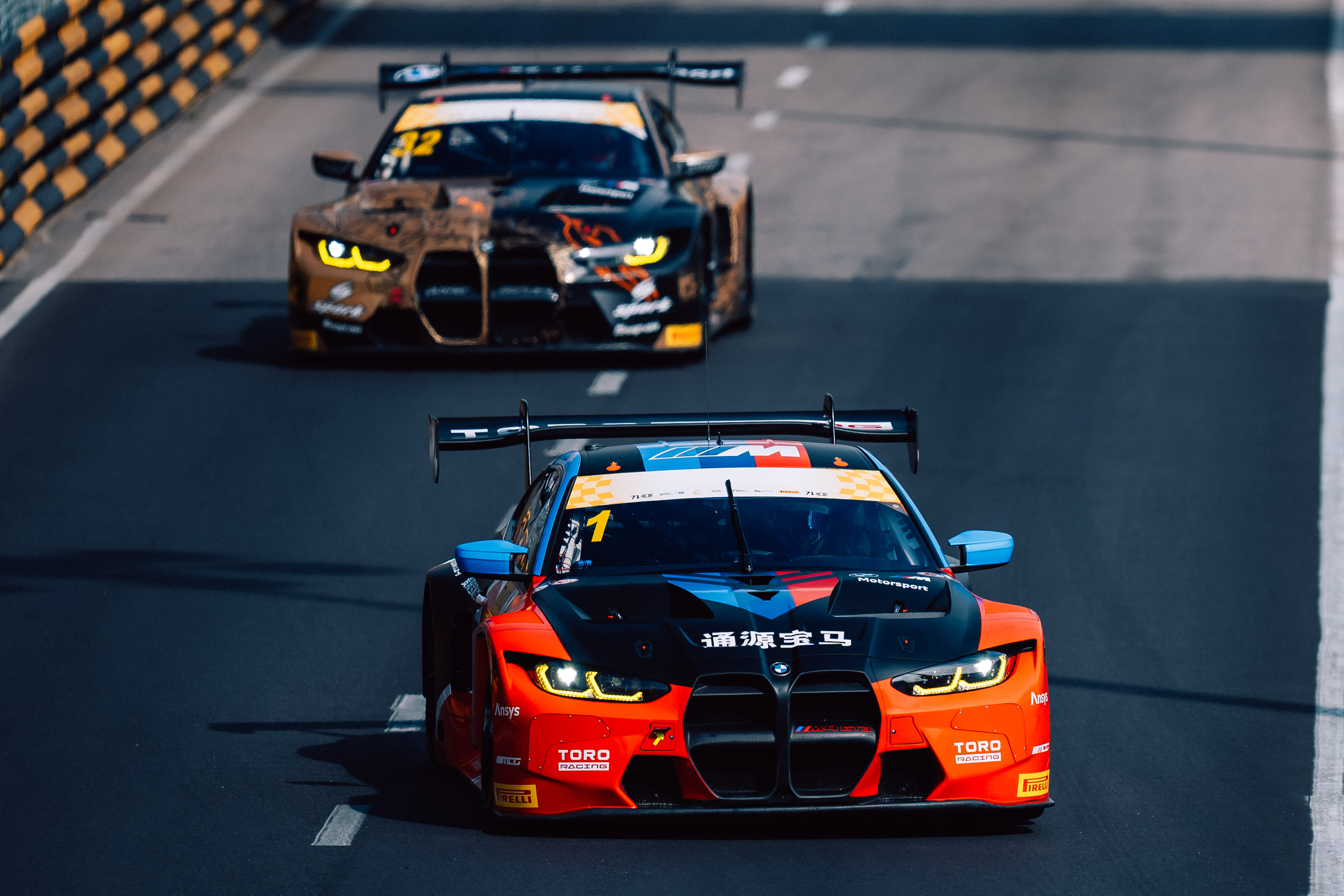 Macau (CHN), 13-17 November 2024. FIA GT World Cup, Guia Circuit, #1 BMW M4 GT3, TORO Racing powered by MCG, Raffaele Marciello, #32 BMW M4 GT3, Team WRT, Dries Vanthoor.