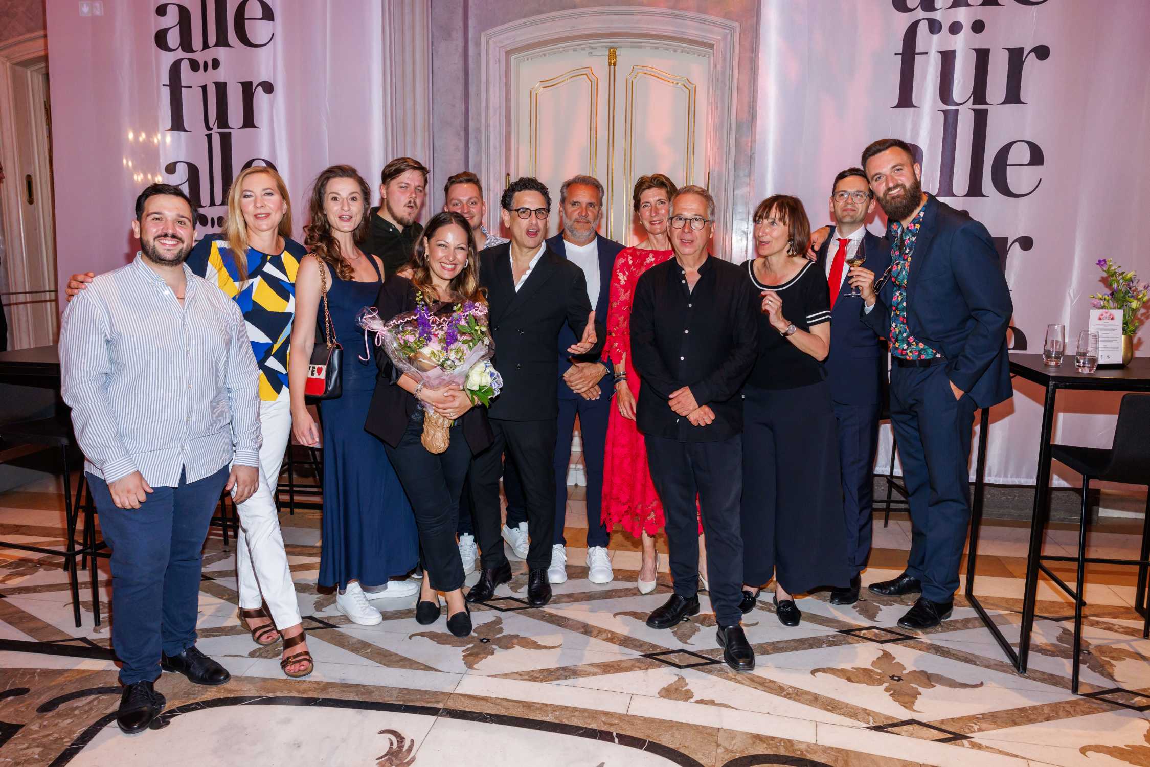 BMW lädt ein zu "Staatsoper für alle" am 21. und 22. Juni 2025 auf dem Bebelplatz in Berlin. Ilka Horstmeier (Mitglied des Vorstands der BMW AG, Personal und Immobilien) und Elisabeth Sobotka (Intendantin der Staatsoper Unter den Linden) mit den Künstlerinnen und Künstlern des Abends. Foto: Gerald Matzka/ProjectImages