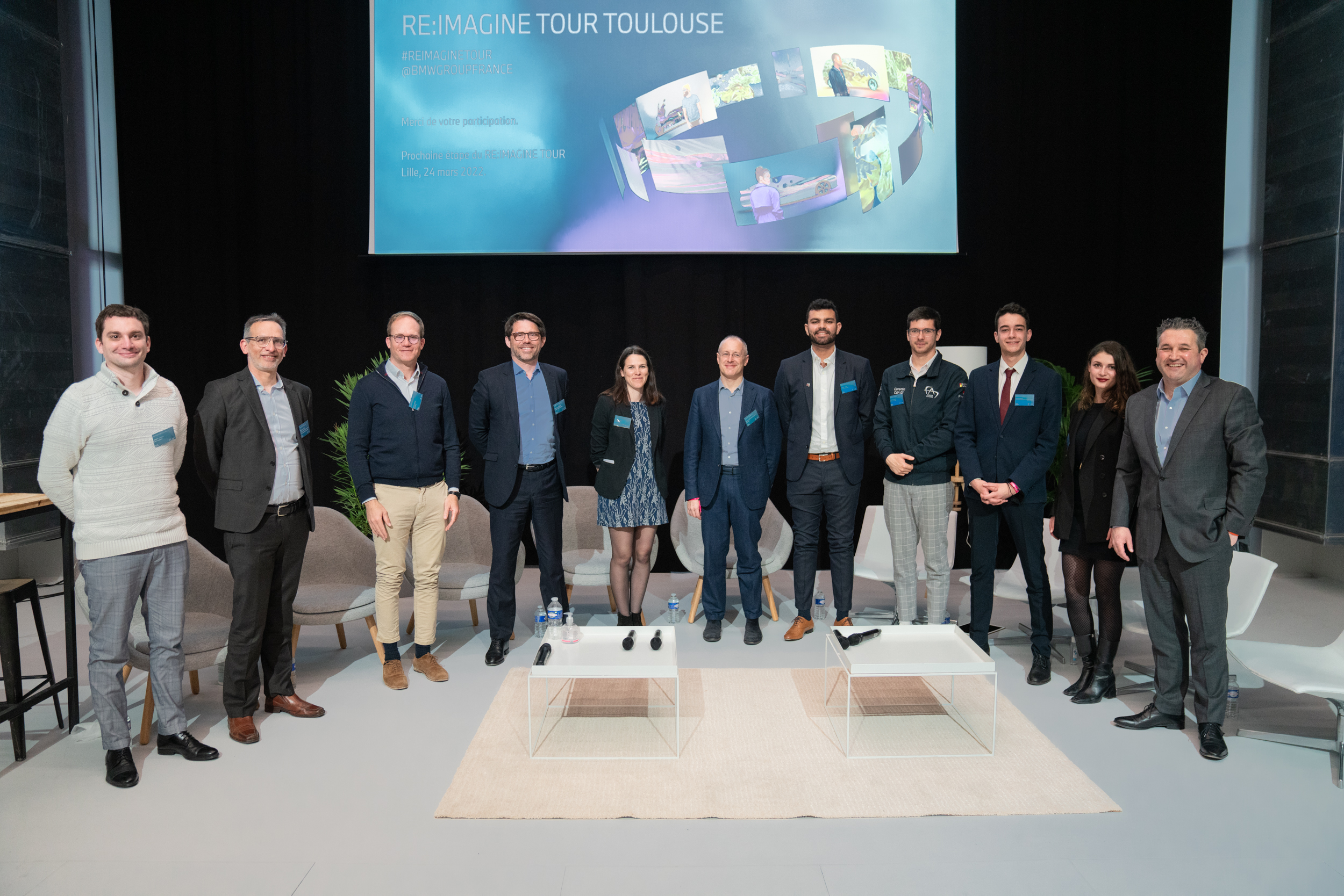 Jérémy Dulout, CEO of BATCONNECT / Benoit Desjeux, Operational Director of the Campus des métiers et des qualifications Mobilité et Transport intelligent / Benoit Perrin, General manager of Easymile / Pierre-Olivier Nau, Président of the MEDEF Haute Garonne / Lucie Mandile, Development Director of Karos / Jean-Luc di Paola, Deputy Director of Public Affairs and Sustainable Development of Valéo / Romain Pupier, Business Development Manager of FA7 Junior-Etudes / Corentin Favier, Business Manager of FA7 Junior-Etudes / Victor Pouille, Vice President of Escadrille / Paloma Vergnaud, Commercial Manager of Escadrille / Vincent Salimon, Chairman of the Board Management Board of BMW Group France (03/2022)