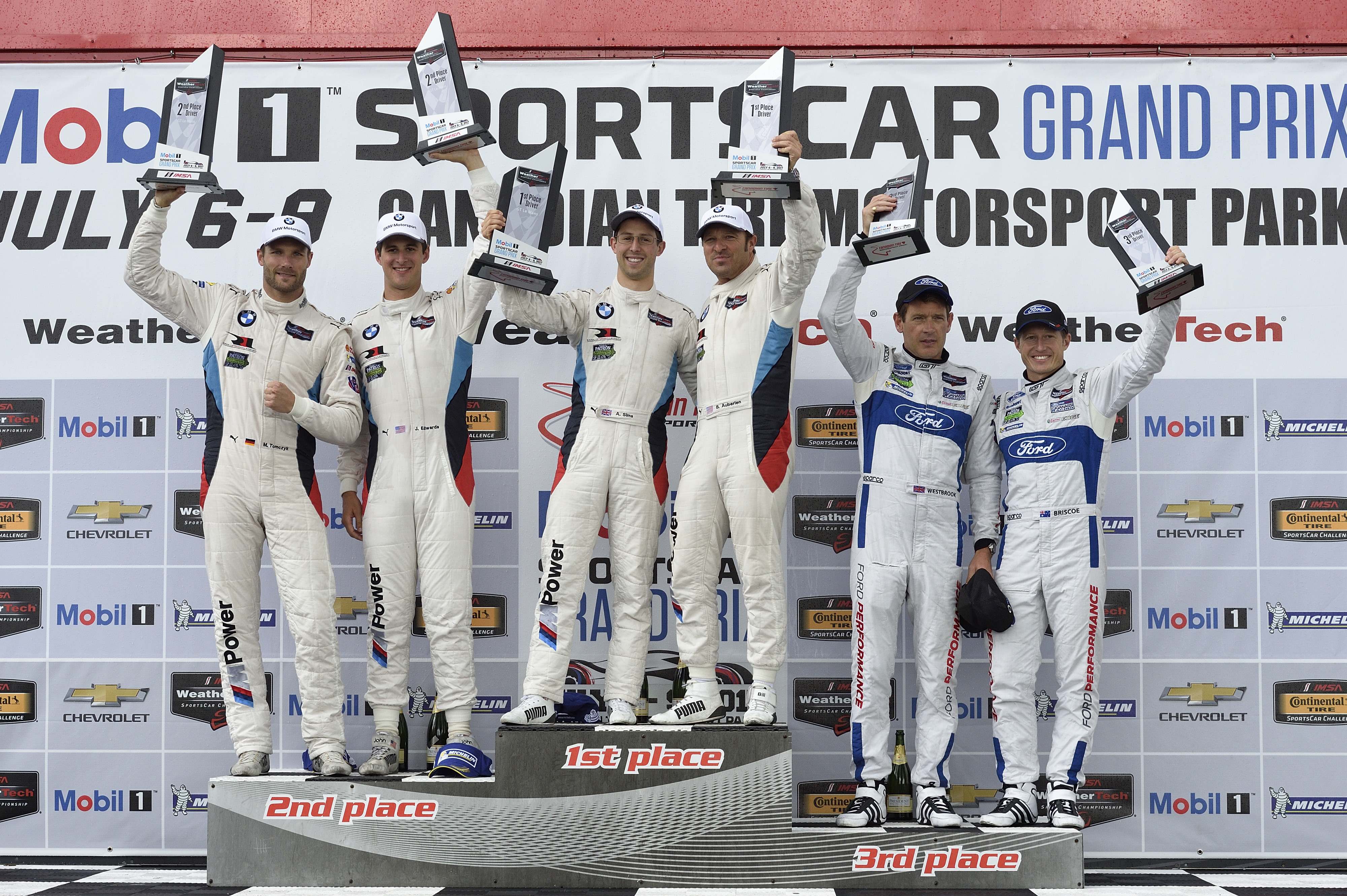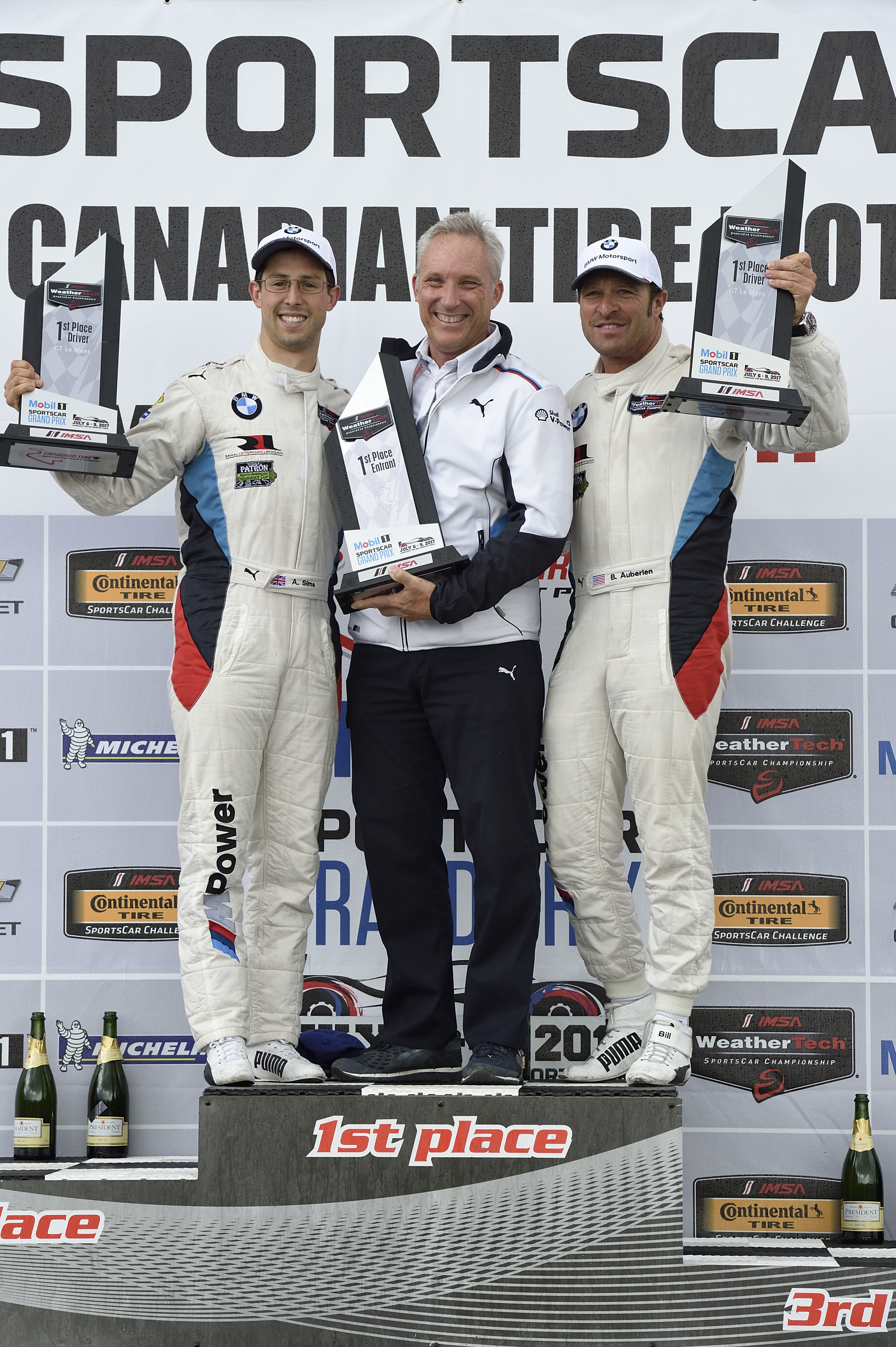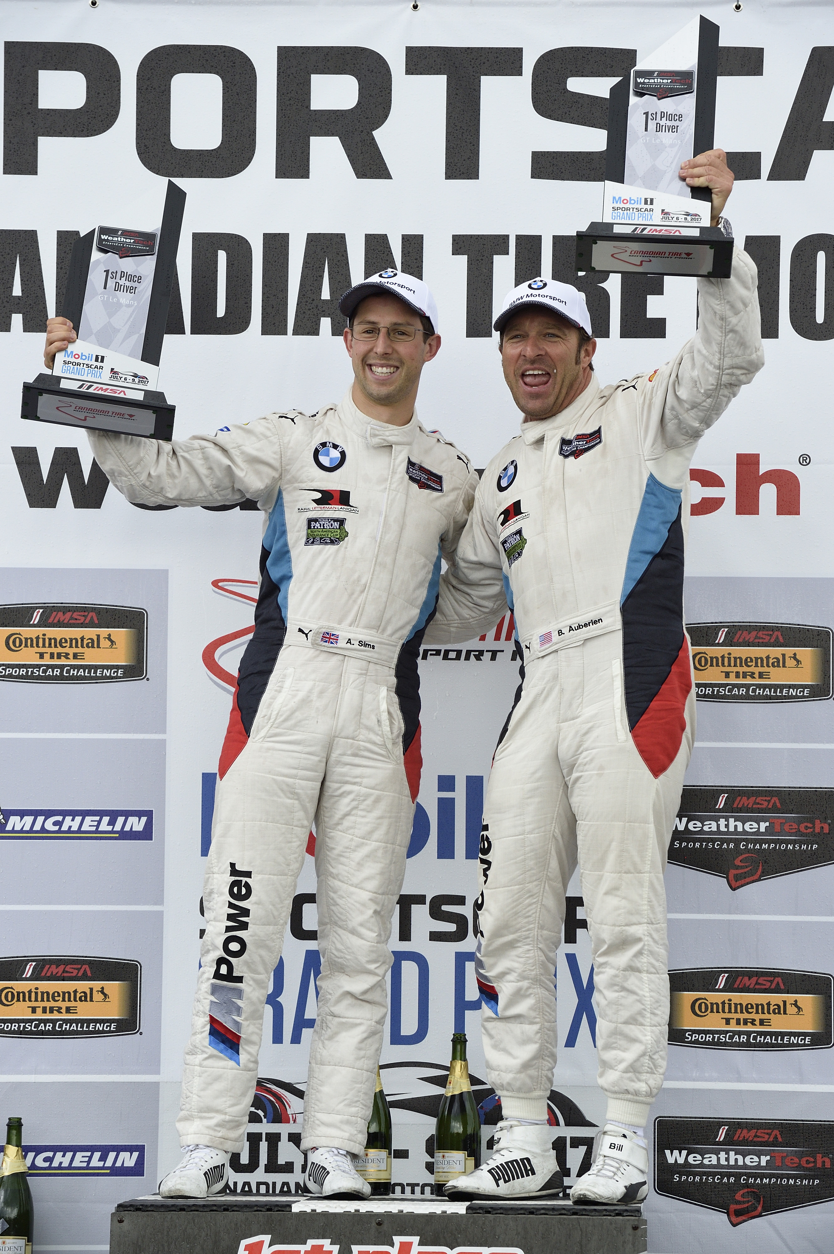 07.07.2017 to 09.07.2017, IMSA WeatherTech Sportscar Championship, Mobil1 Sportscar Grand Prix, Canadian Tire Motorsport Park, Bowmanville, Ontario (CAN). Bill Auberlen (USA), Alexander Sims (GBR), No 25, BMW Team RLL, BMW M6 GTLM. 1st Place in GTLM Class. John Edwards (USA), Martin Tomczyk (DEU), No 24, BMW Team RLL, BMW M6 GTLM. 2nd Place in GTLM Class. Podium celebrations.