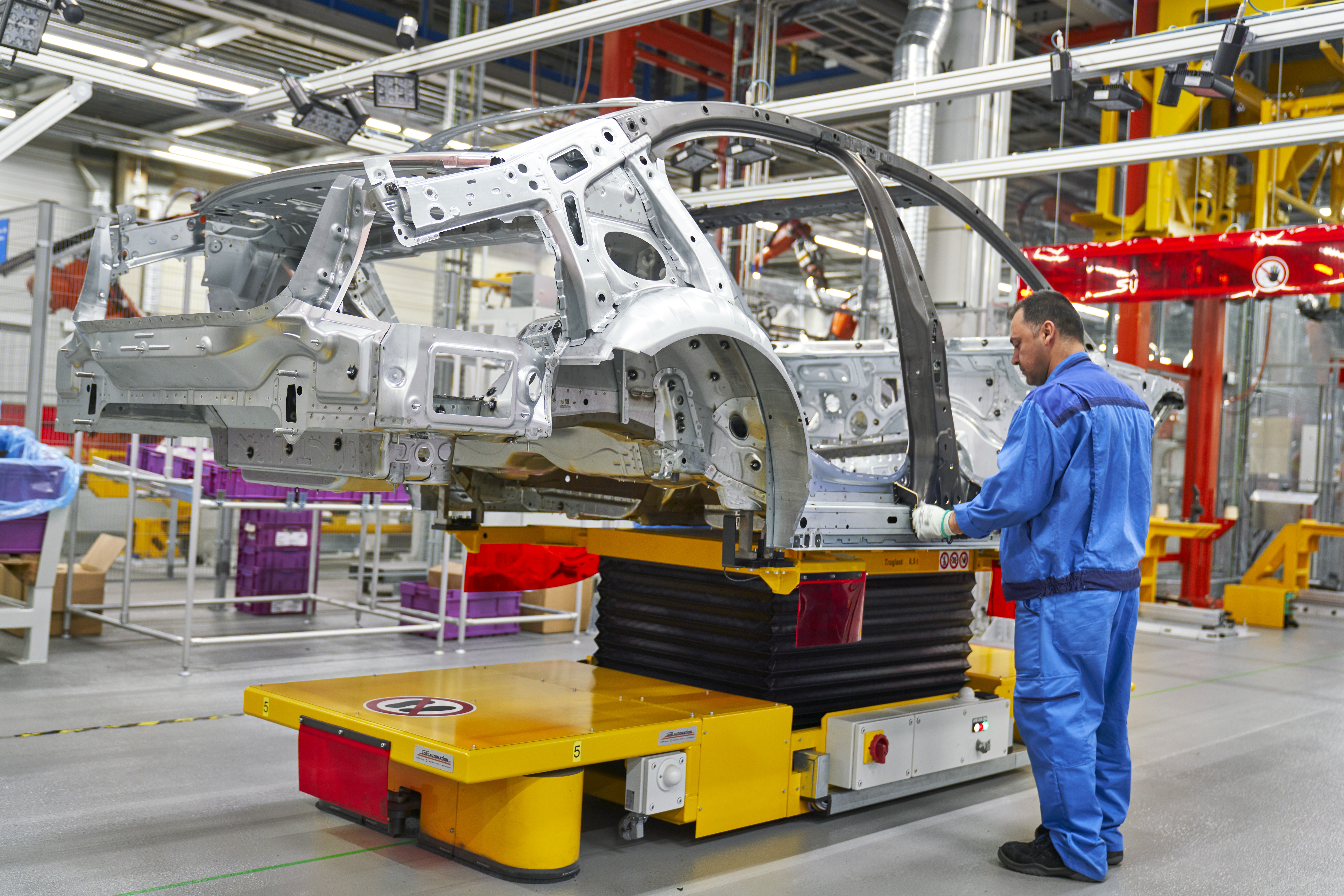 Employee assembles car body part; car body on driverless transport system, BMW Group Plant Munich (11/2018)