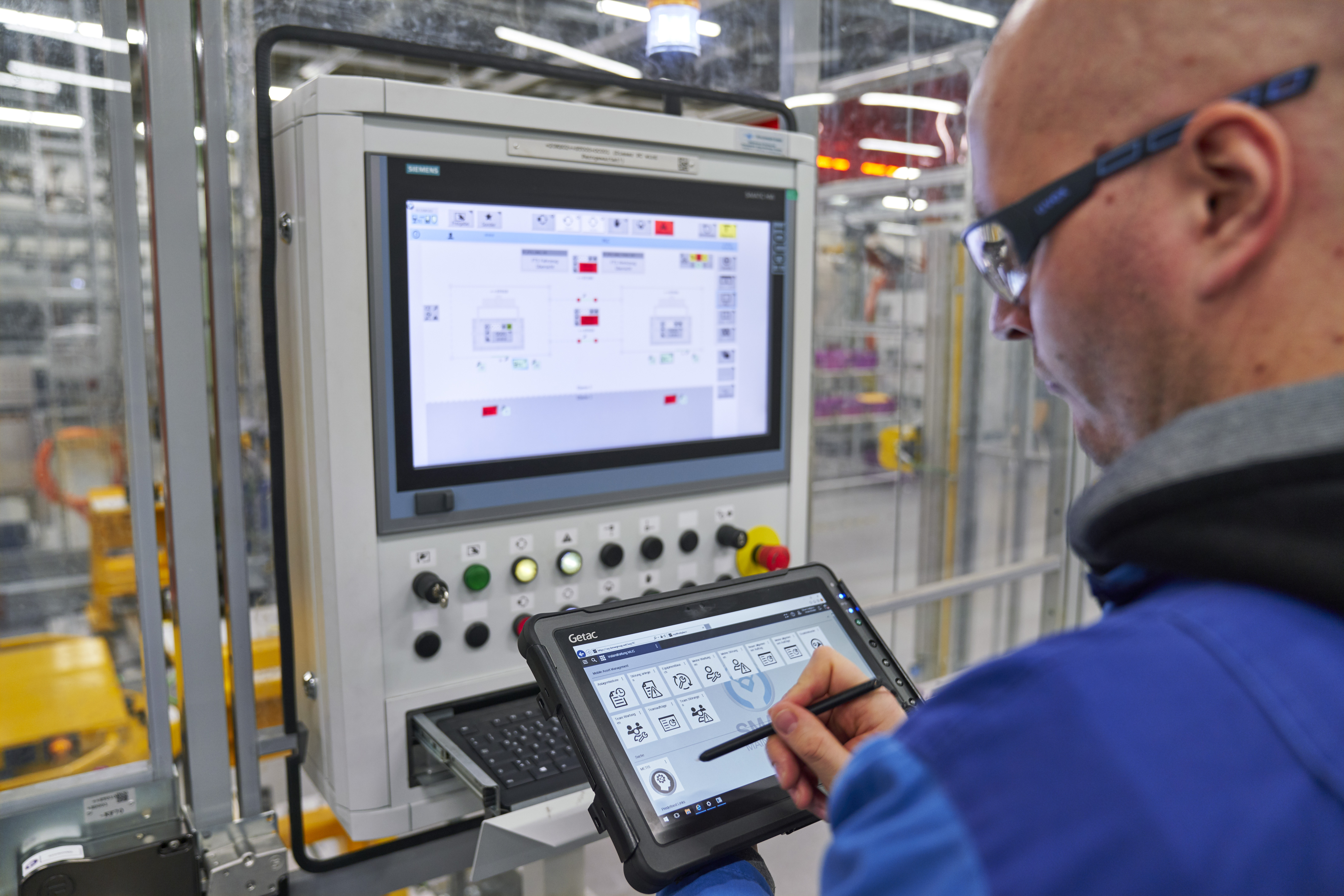Employee working with smart maintenance tool at body shop, BMW Group Plant Munich (11/2018)