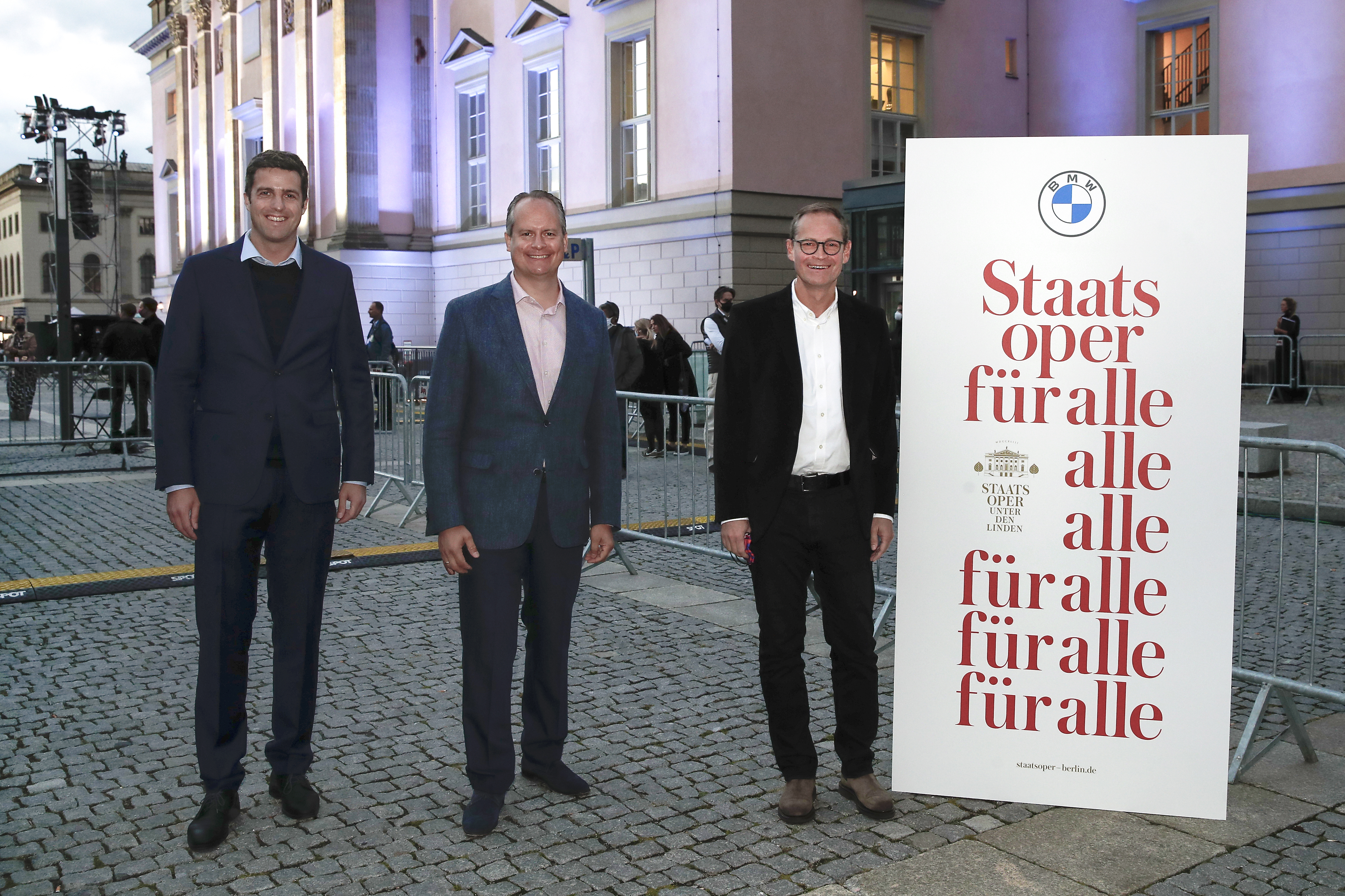 “State Opera for All” 2020: Matthias Schulz (Director Staatsoper Unter den LindenSebastian Mackensen (BMW Group Senior Vice President Market Germany), Michael Müller (Governing Mayor of Berlin) (f.l.t.r.) at the Bebelplatz in Berlin on September 6,2020. Photo: Franziska Krug/Getty Images (09/2020)