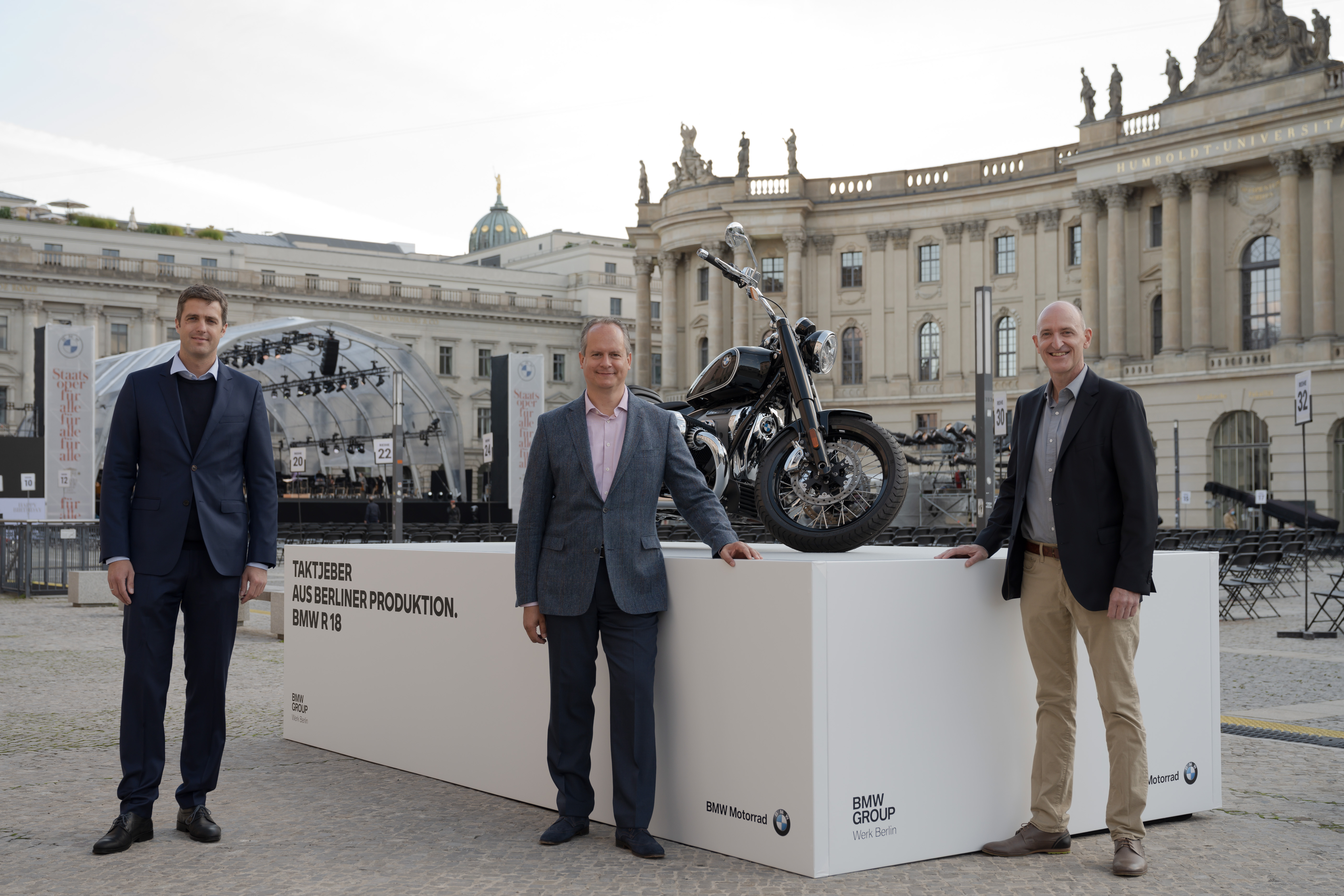 “State Opera for All” 2020: Matthias Schulz (Director Staatsoper Unter den Linden), Sebastian Mackensen (BMW Group Senior Vice President Market Germany), Prof. Dr Helmut Schramm (Head of Production BMW Motorrad and Head of plant Berlin BMW Motorrad) (f.l.t.r.) in front of the BMW R18 at the Bebelplatz in Berlin on September 6, 2020. Photo: Peter Adamik (09/2020)