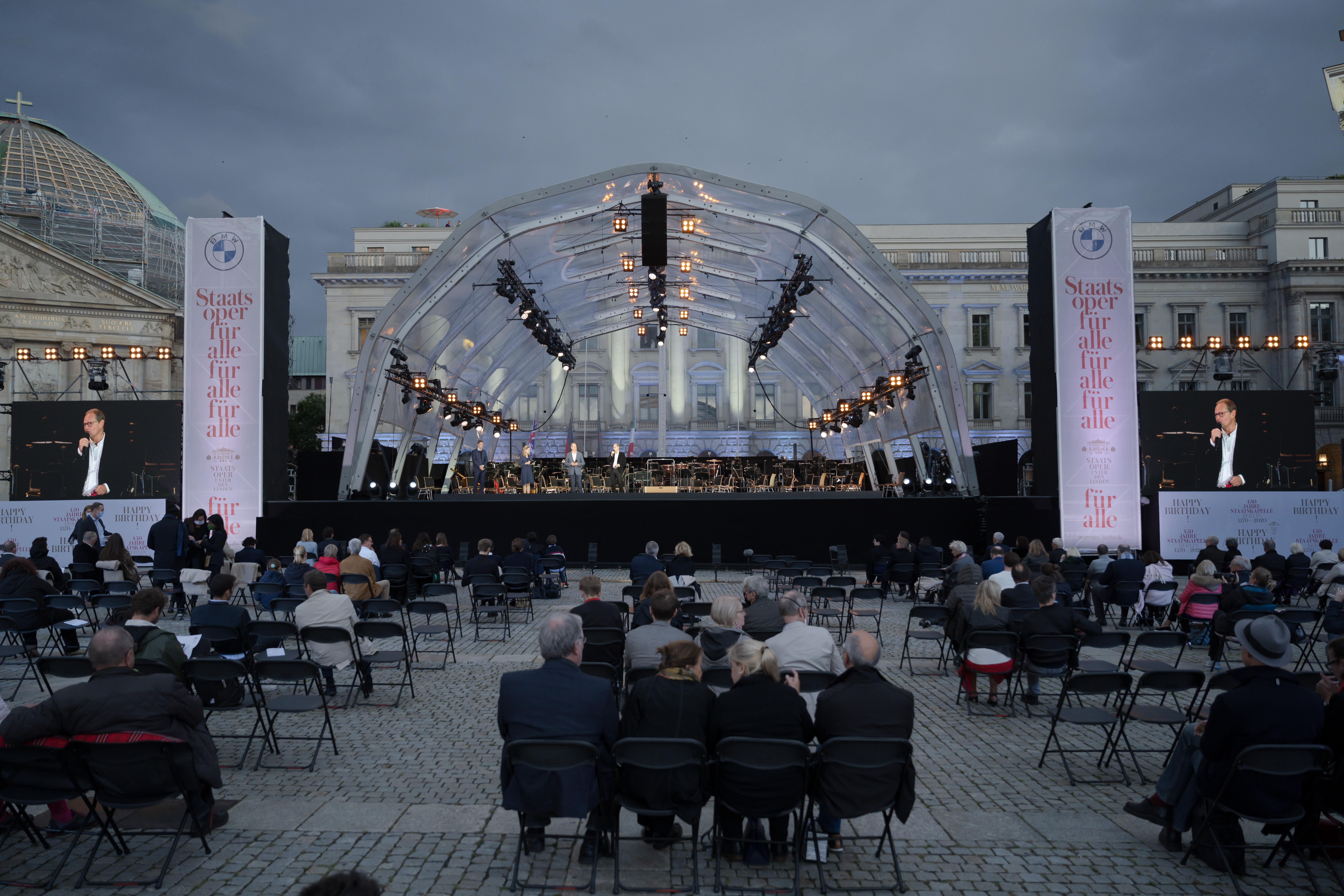 “State Opera for All” 2020: Matthias Schulz (Director Staatsoper Unter den Linden), Lisa Ruhfus (moderator ZDFkultur), Sebastian Mackensen (BMW Group Senior Vice President Market Germany), Michael Müller (Governing Mayor of Berlin) (f.l.t.r.) at the Bebelplatz in Berlin on September 6,2020. Photo: Franziska Krug/Getty Images (09/2020)