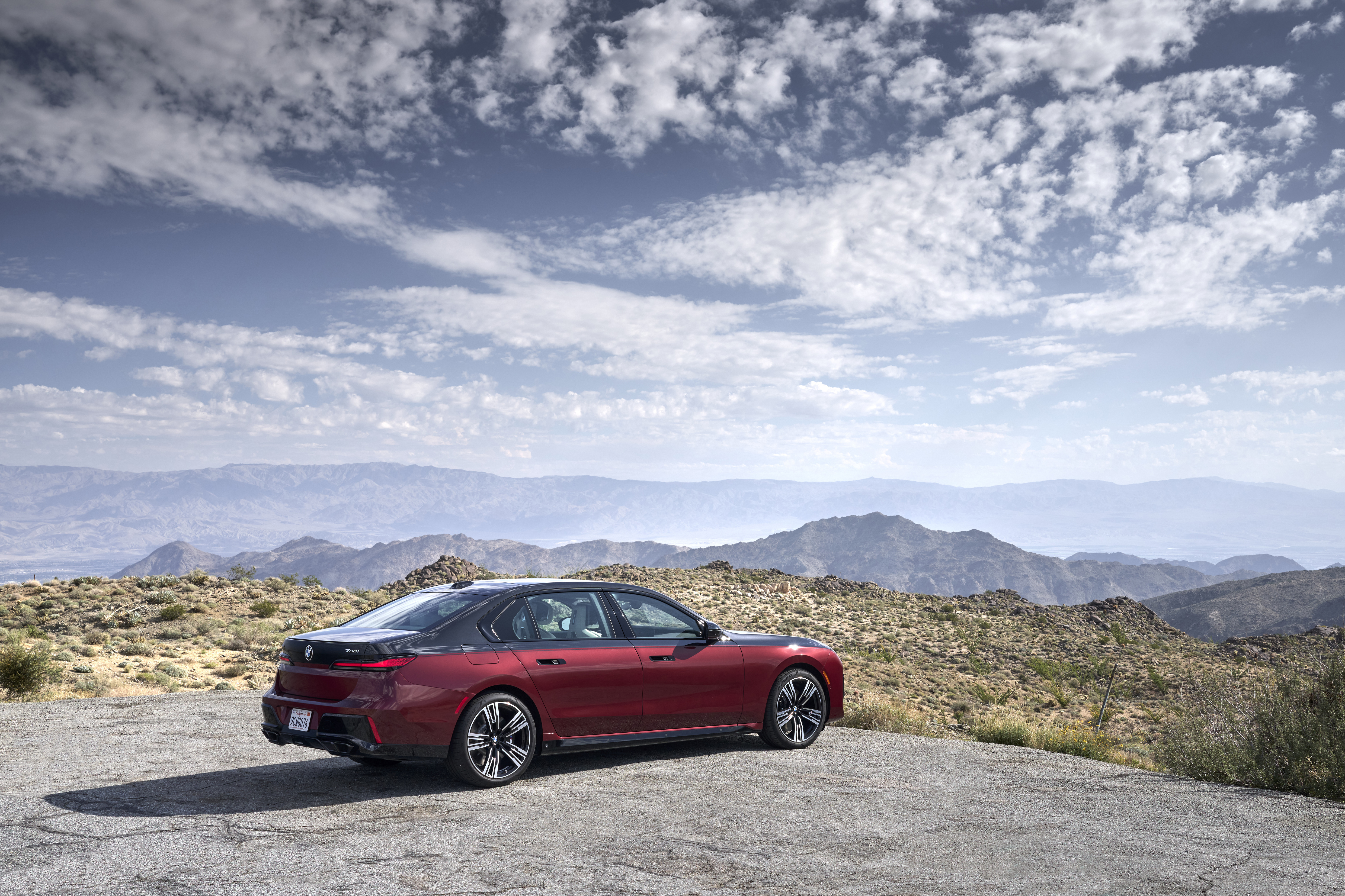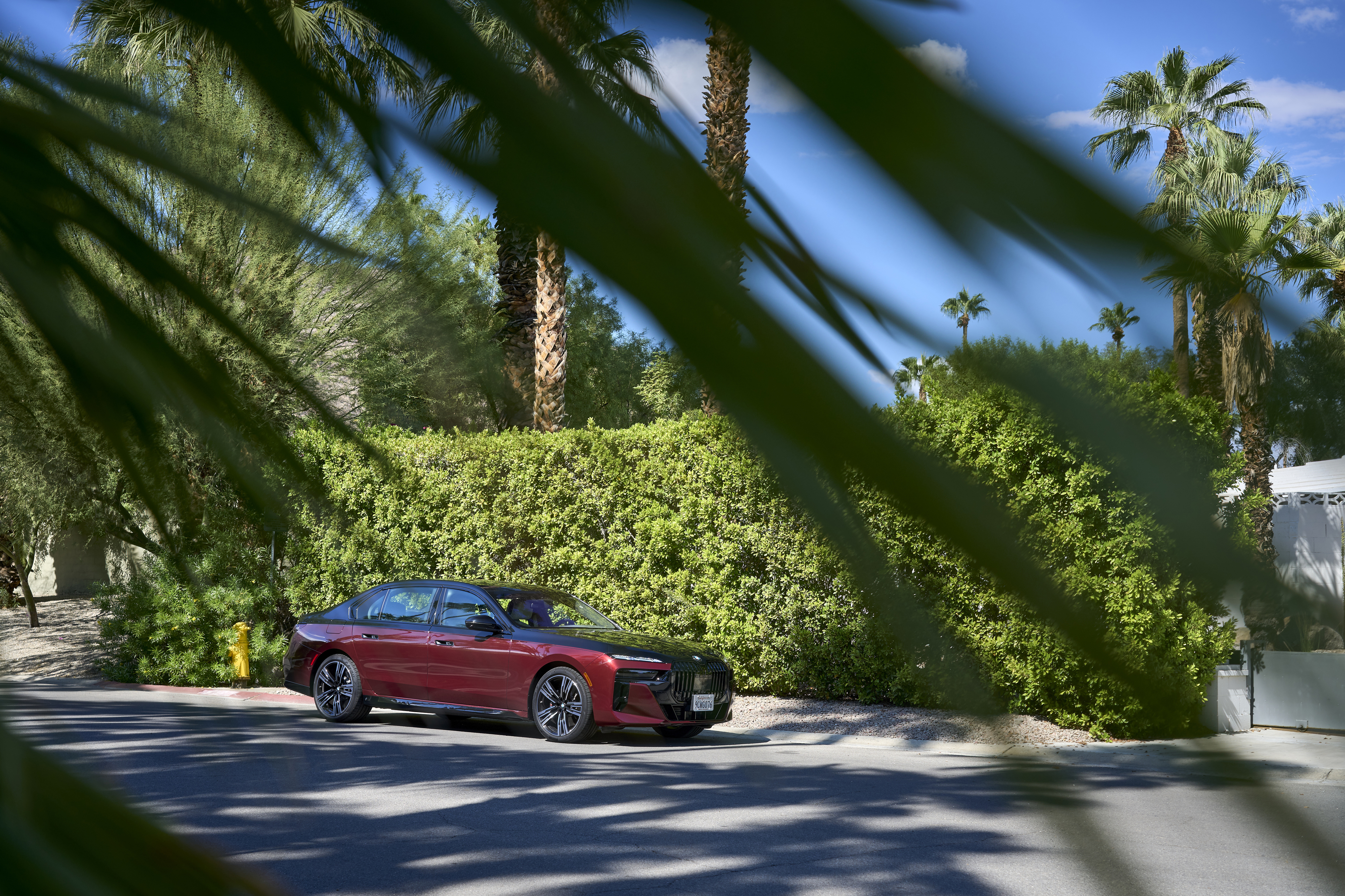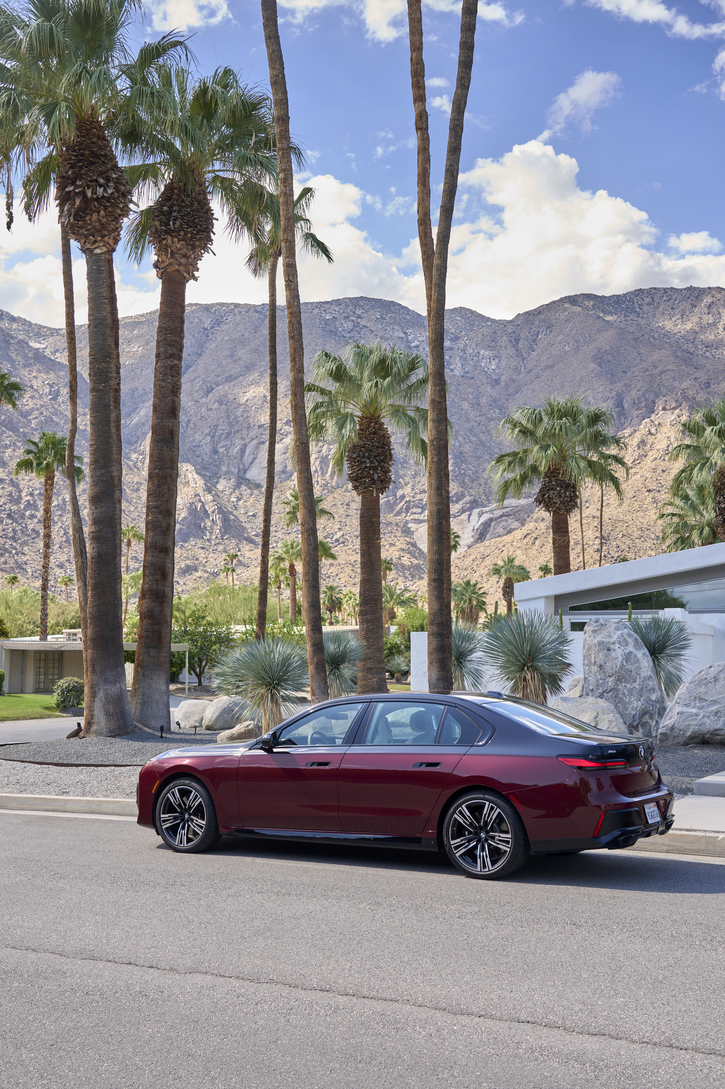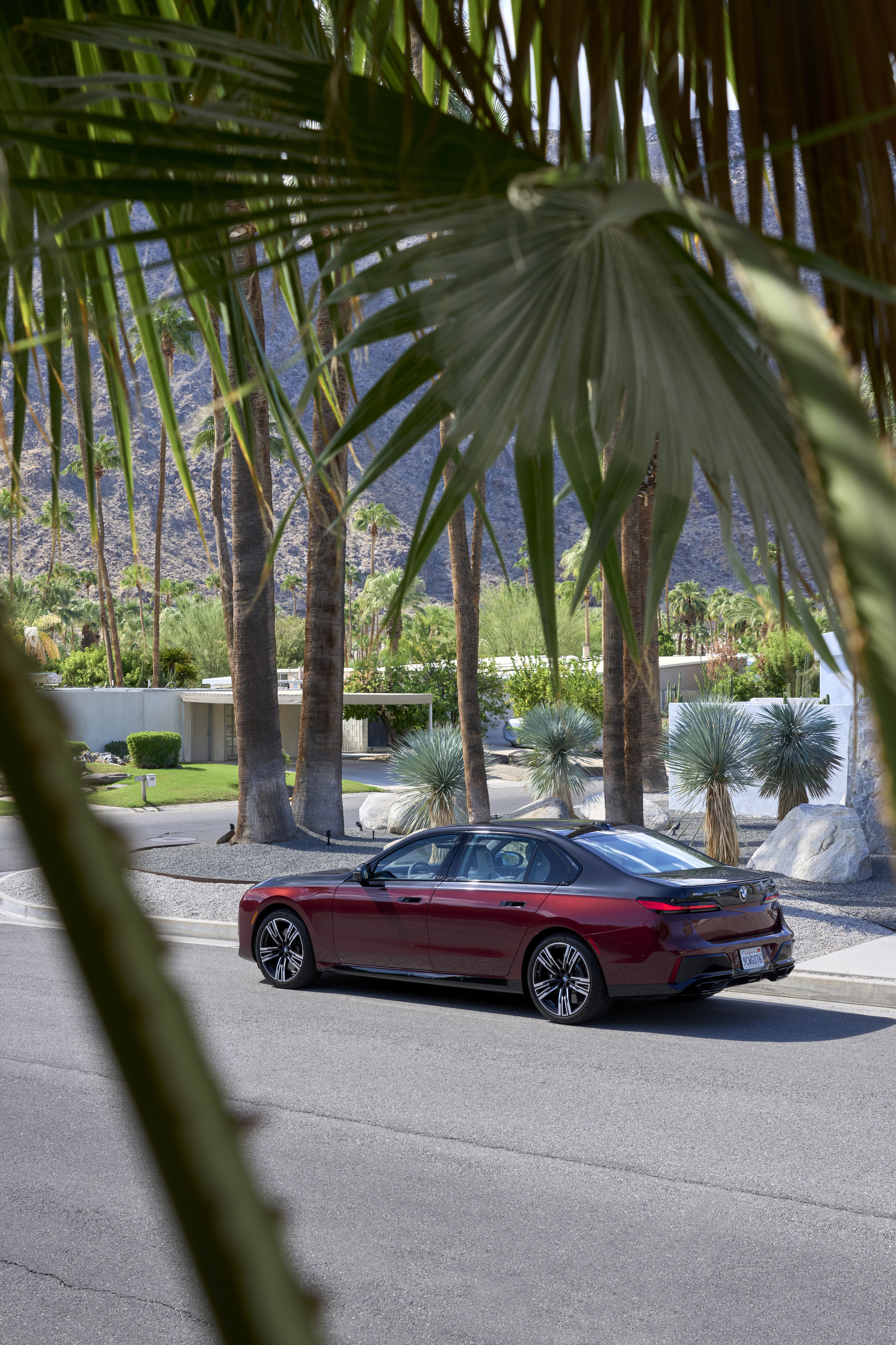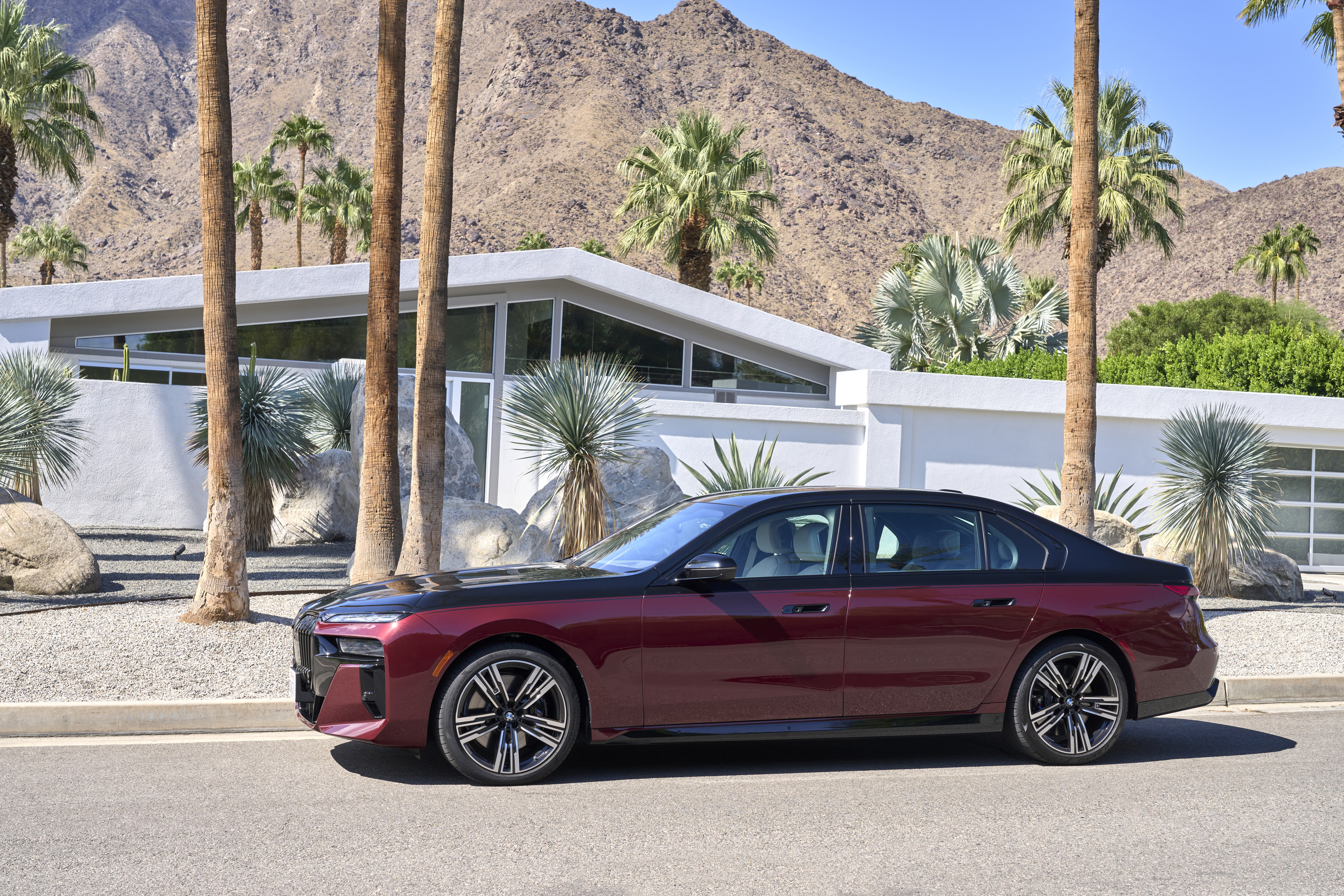 The new BMW 760i xDrive Aventurin Red Metallic Two-Tone On Location Palm Springs (10/2022).
