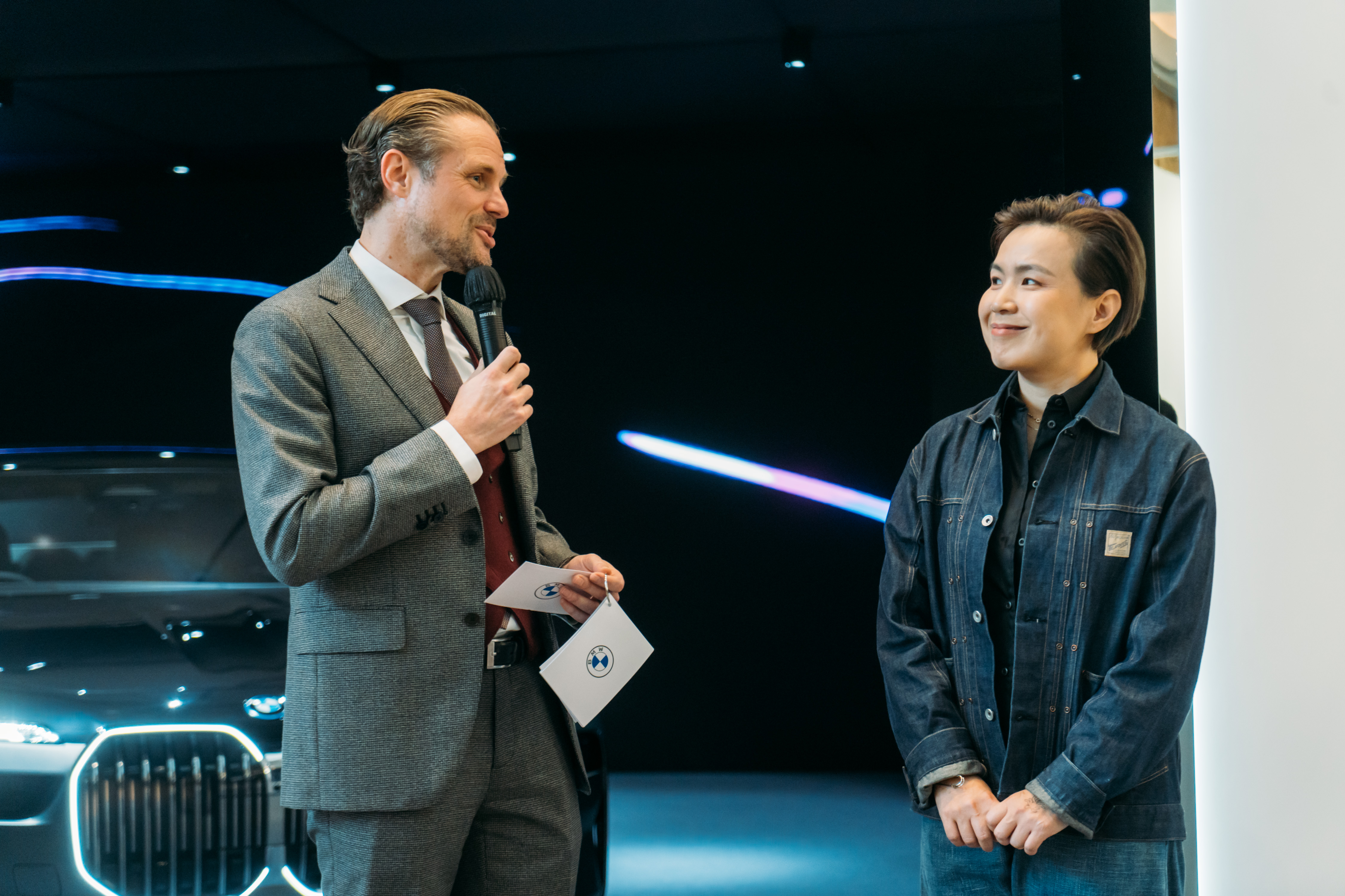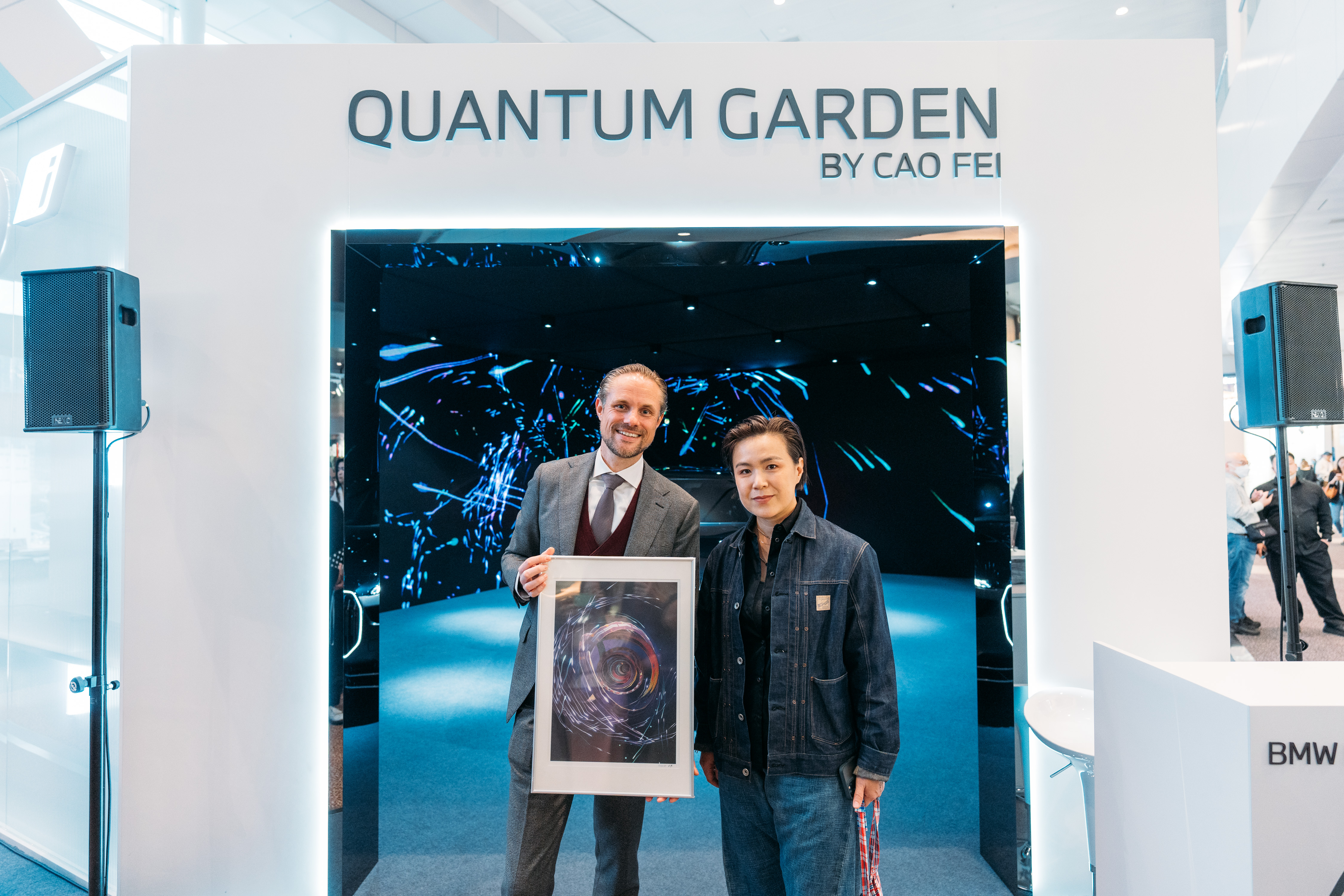 My Mode Digital Art “Quantum Garden” by multimedia artist Cao Fei and the BMW i7 at the BMW Lounge at Art Basel in Hong Kong. Martijn Oremus, Managing Director, BMW Hong Kong Services Limited and Cao Fei. Photo: Michael Wong. (03/2023)