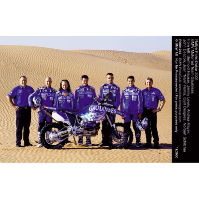Rallye Paris-Dakar 2001 - BMW Motorrad Team Gauloises - from left: Berthold Hauser, Jimmy Lewis, Andrea Mayer, John Daecon, Juan "Nani" Roma, Cyril Despres, Norbert Schilcher