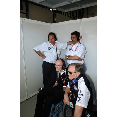 Saturday, March 30, 2002 Brazilian Grand Prix , Sao Paulo , Brazil. Gerhard Berger and Dr. Mario Theissen (BMW Motorsport Directors) with Frank Williams and Patrick Head WilliamsF1 Technical Director