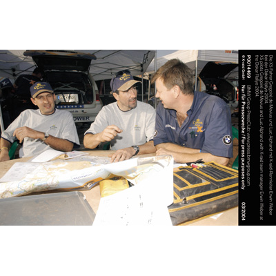 Die X5 Fahrer Gregoiré de Mevius und Luc Alphand mit X-raid-Rennleiter Erwin Weber bei der Dakar Rallye 2004 (03/2004)