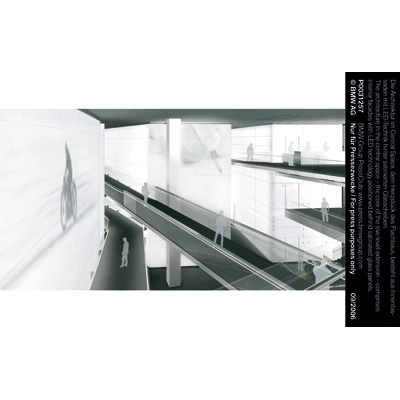 The architecture in the central space – the core of the low-level extension – comprises interior facades with LED technology positioned behind satinated glass panels (09/2006)