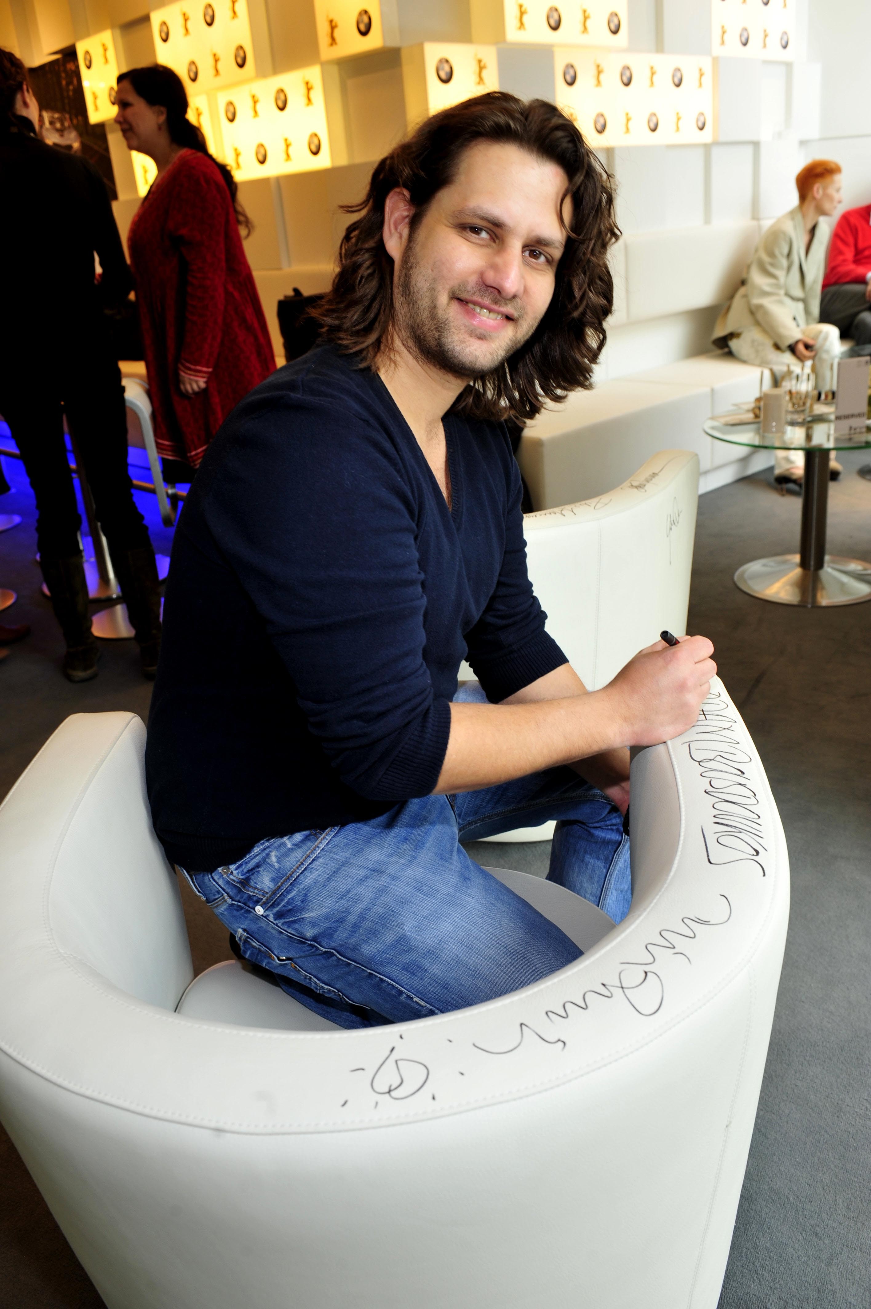 Adam Bousdoukos ("Soul Kitchen") signiert den Ledersessel, der mit den Unterschriften von Promis von BMW zugunsten der Jose Carreras-Stiftung versteigert wird Berlinale 2010, BMW Golden Bear Lounge, Berlin, 14.2.2010 (c.) BMW