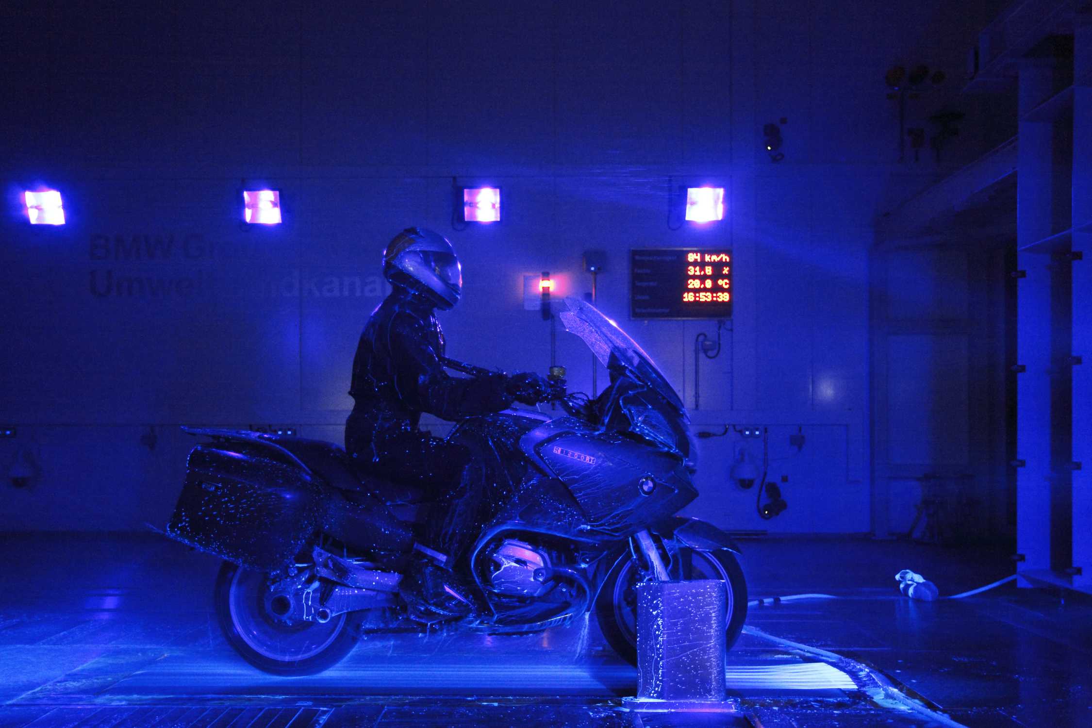 The new Energy and Environmental Test Centre - Climatic wind tunnel - rain simulation with the BMW R 1200 RT on the motorcycle flatbelt (05/2010)