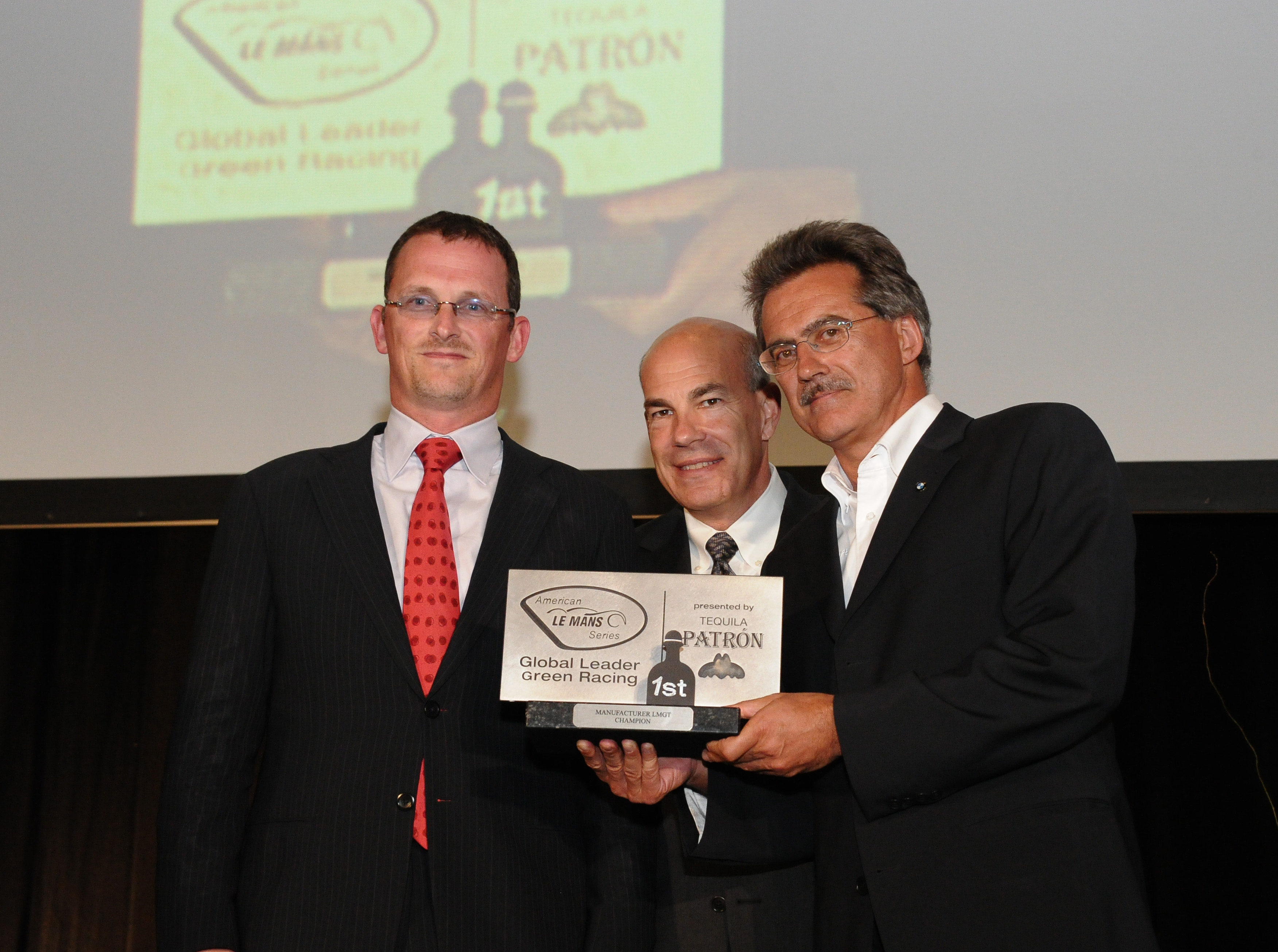ALMS President & CEO Scott Atherton (center) presents to BMW NA Motorsport Manager Martin Birkmann (L), and BMW Motorsport Director Dr. Mario Theissen the American Le Mans Series 2010 Manufacturer's Championship trophy at the ALMS annual banquet in Atlanta. 3 October 2010.