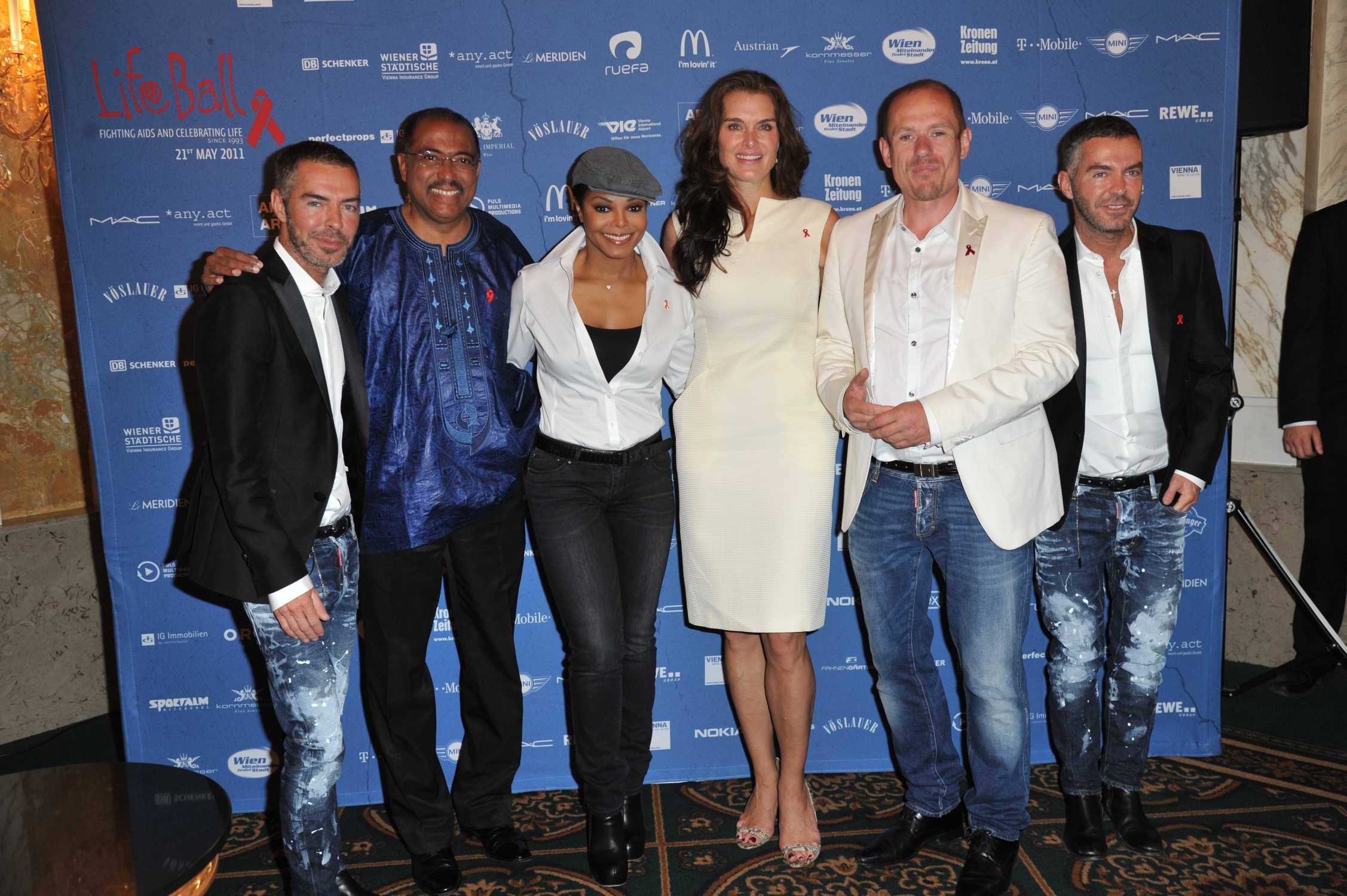 Life Ball 2011: Dean and Dan Caten with Michael Besibe, Janet Jackson, Brooke Shields und Gery Keszler. (05/2011)