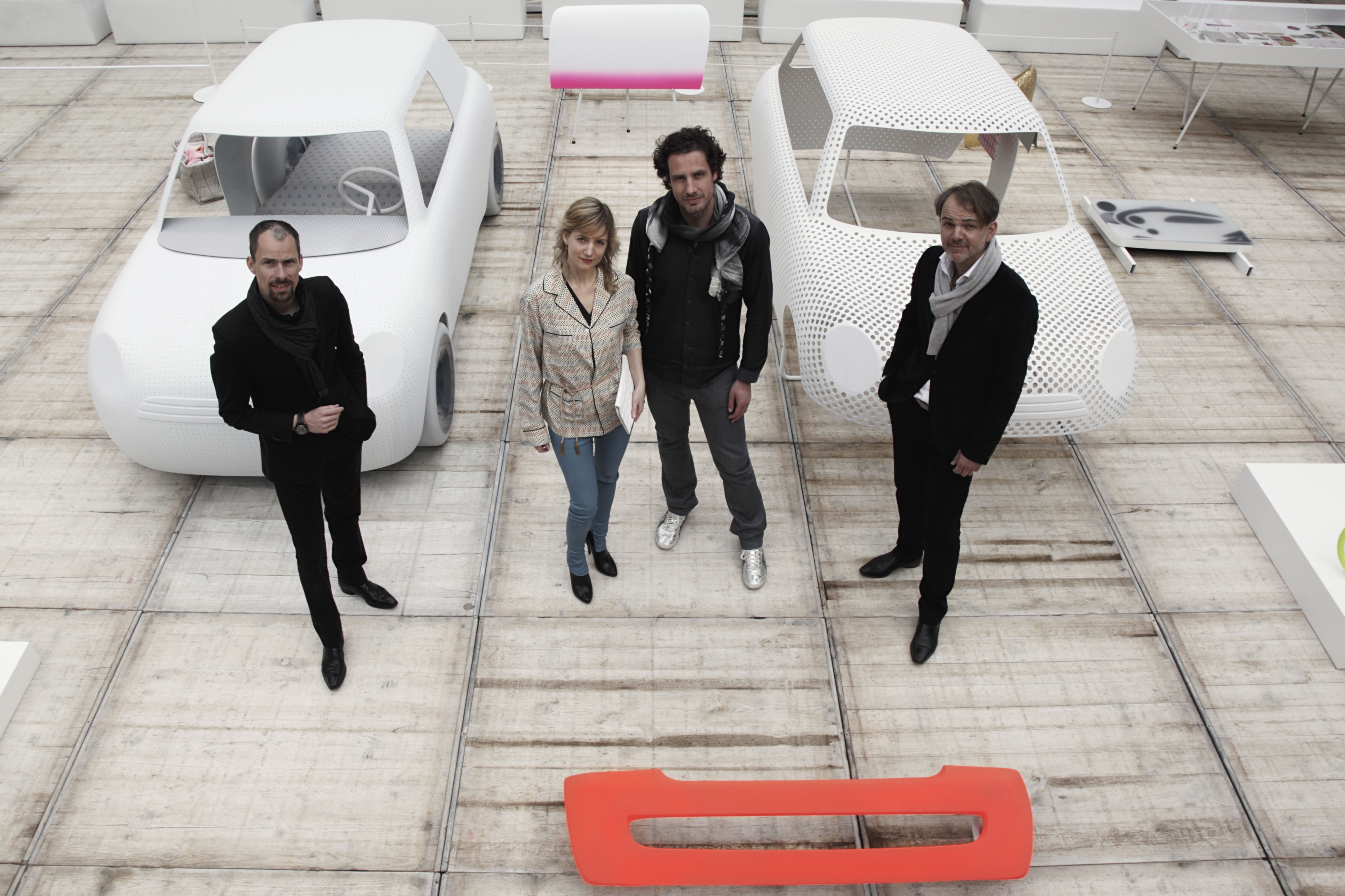 f.l.t.r.: Anders Warming, Head of MINI Design, Carole Baijings, Stefan Scholten and Adrian van Hooydonk, Head of BMW Group Design, in front of Installation (04/2012)