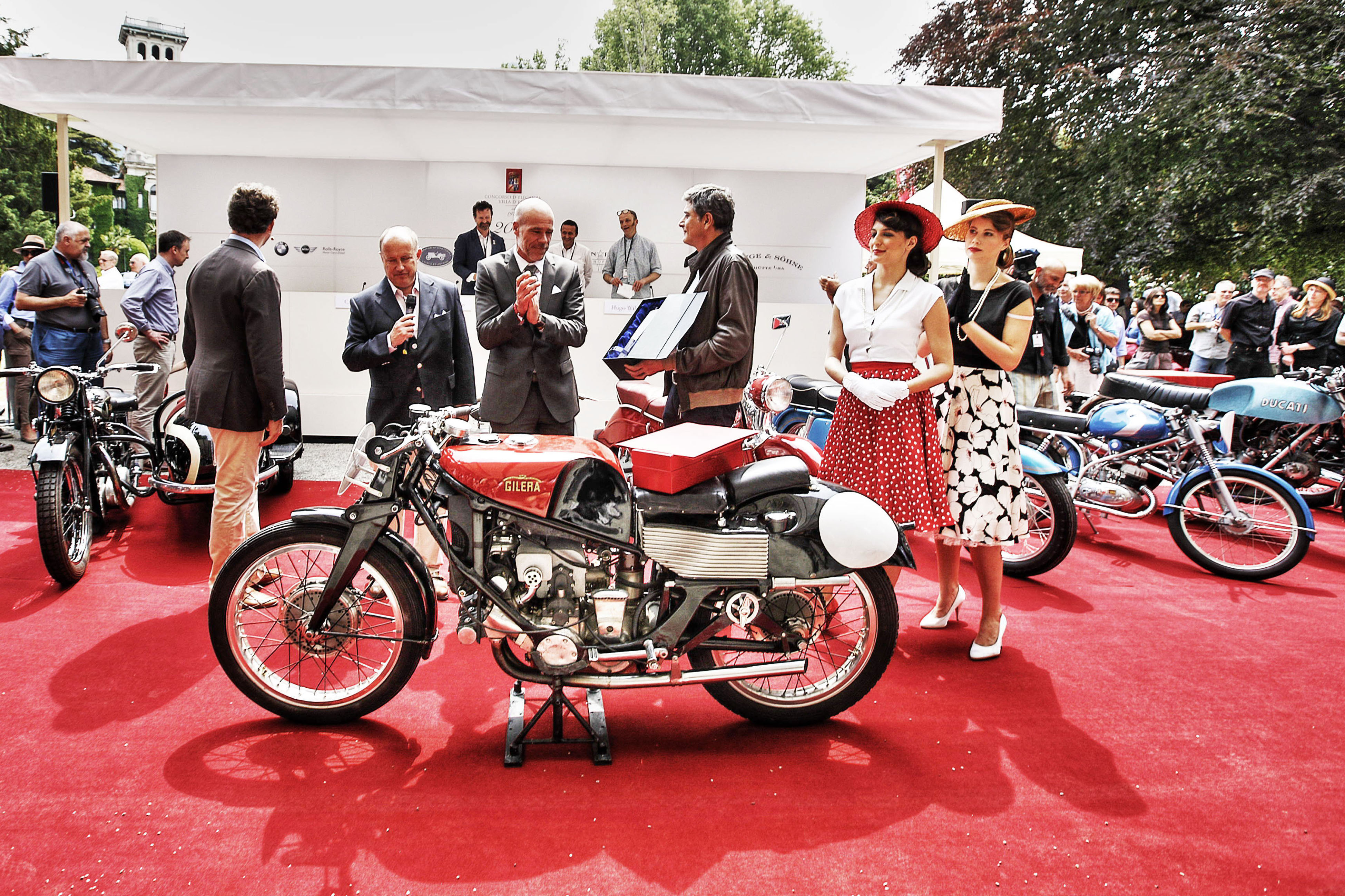 Cernobbio (CO), Villa Erba 27 May 2012. The Trofeo BMW Group, Best of Show, in the Second Concorso d'Eleganza Villa d'Este for motorcycles was awarded to the Italian Gilera 550 Rondine. Hendrik von Kuenheim, President of BMW Motorrad, is giving the prize (05/2012).