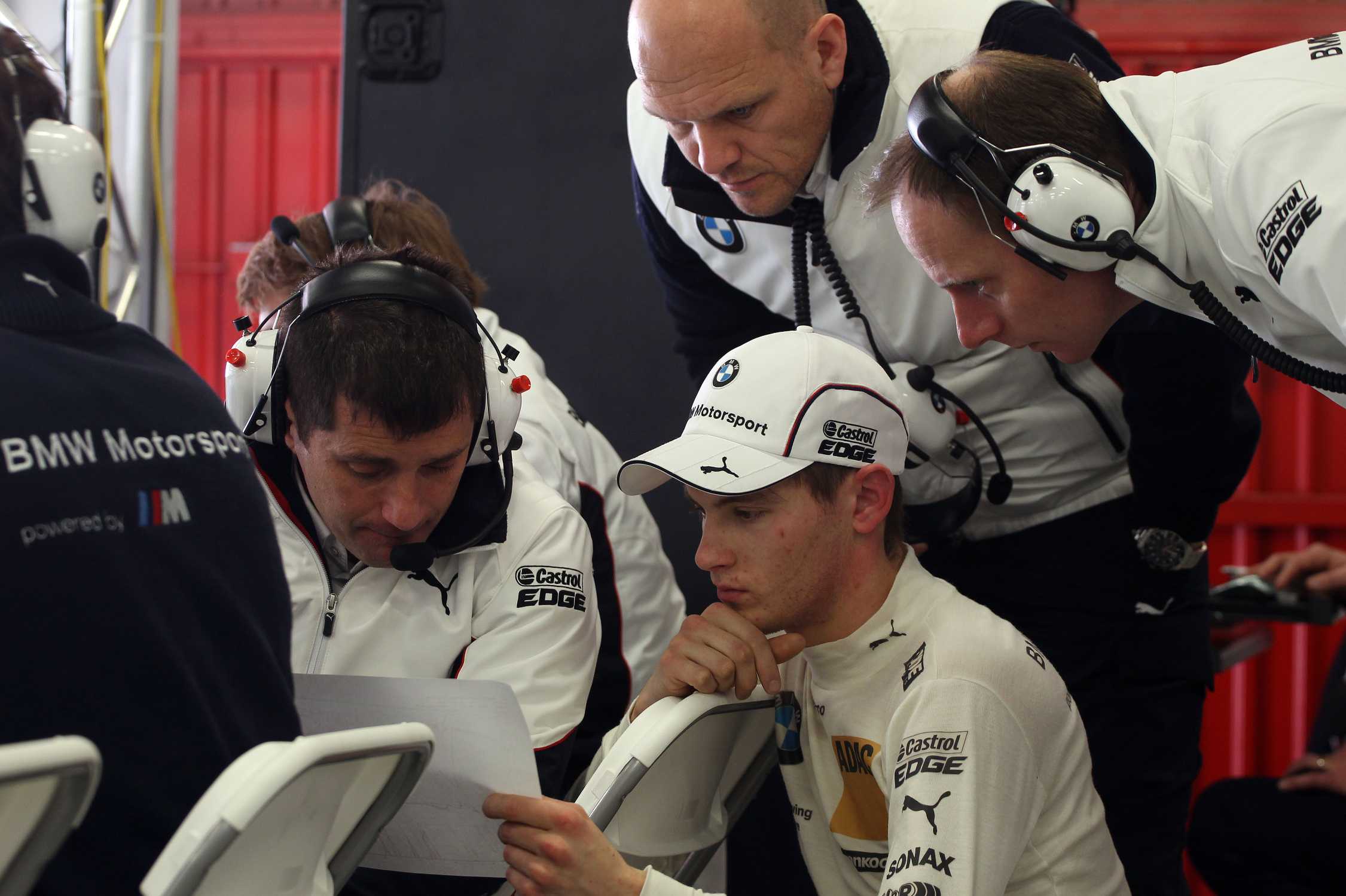 Barcelona (ES) 28th March 2013. BMW Motorsport, Race Engineer Antonio Cuquerella (ES), Marco Wittmann (DE) BMW Works Driver, Ernest Knoors Team Principal BMW Team MTEK and Engineer Mark Hutcheson (GB), BMW Team MTEK. This image is copyright free for editorial use © BMW AG (03/2013).