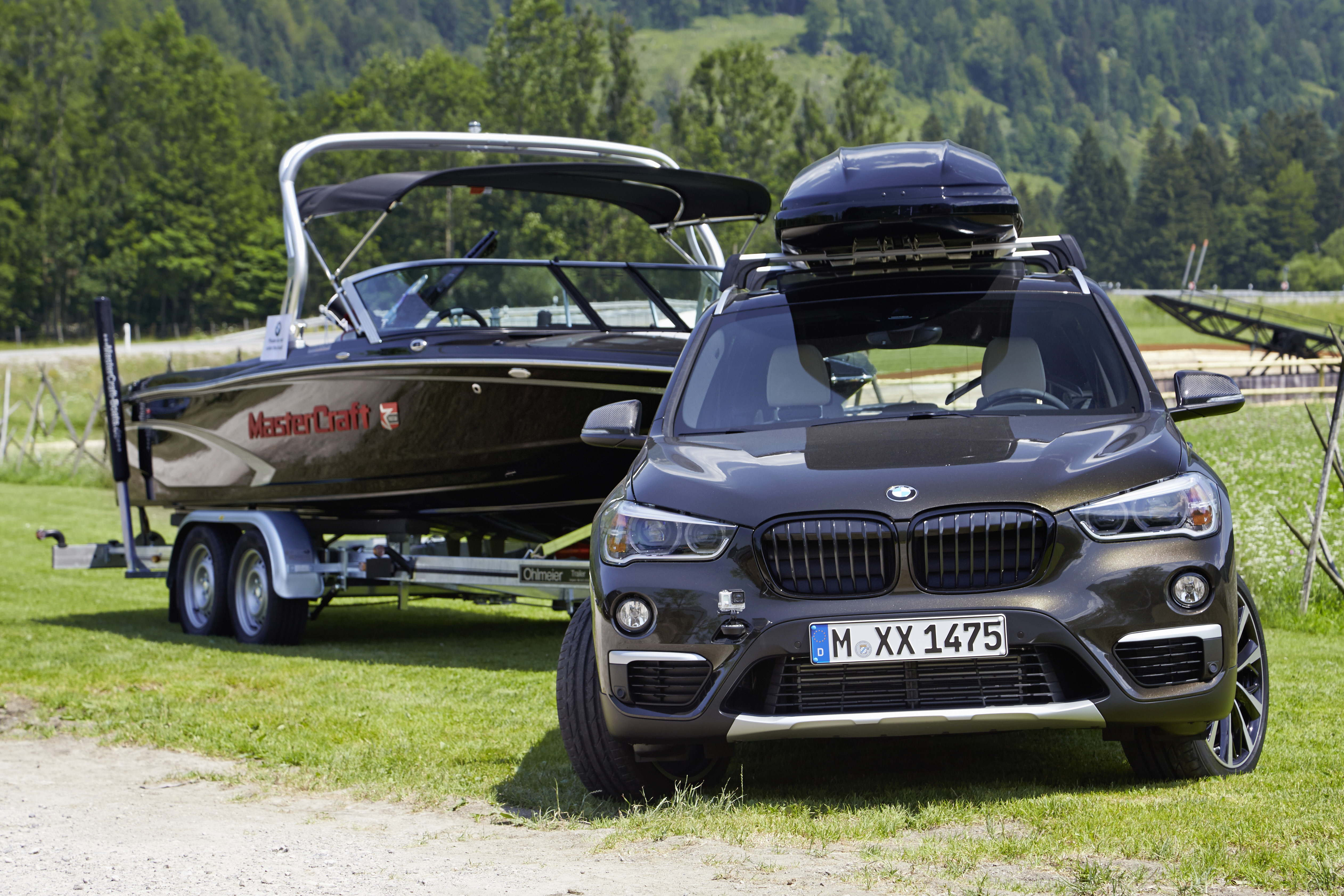 The new BMW X1. On location pictures. 19" V-Spoke 573, black bright turned, alloy wheel. Carbon fiber exterior mirror caps. Kidney grilles in black high-gloss BMW roof box 460 black with design decal "X". M Performance Track Fix for GoPro cameras. (07/2015)
