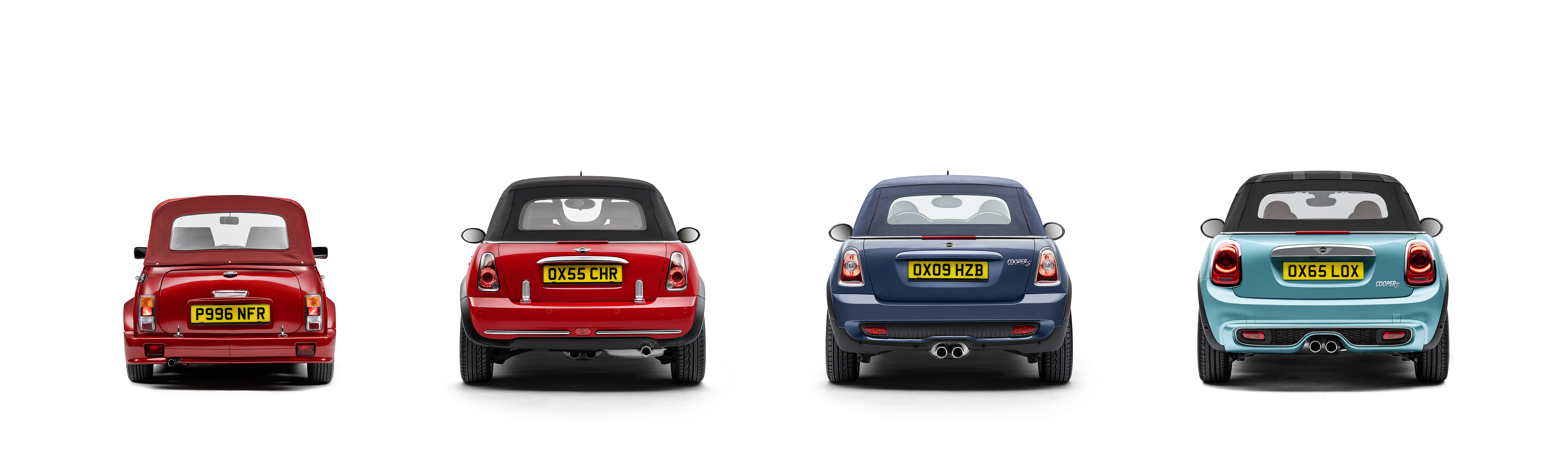The new MINI Convertible and its predecessors: Mini Cabriolet (1996), MINI One Convertible (2005), MINI Cooper S Convertible (2009) and MINI Cooper S ...