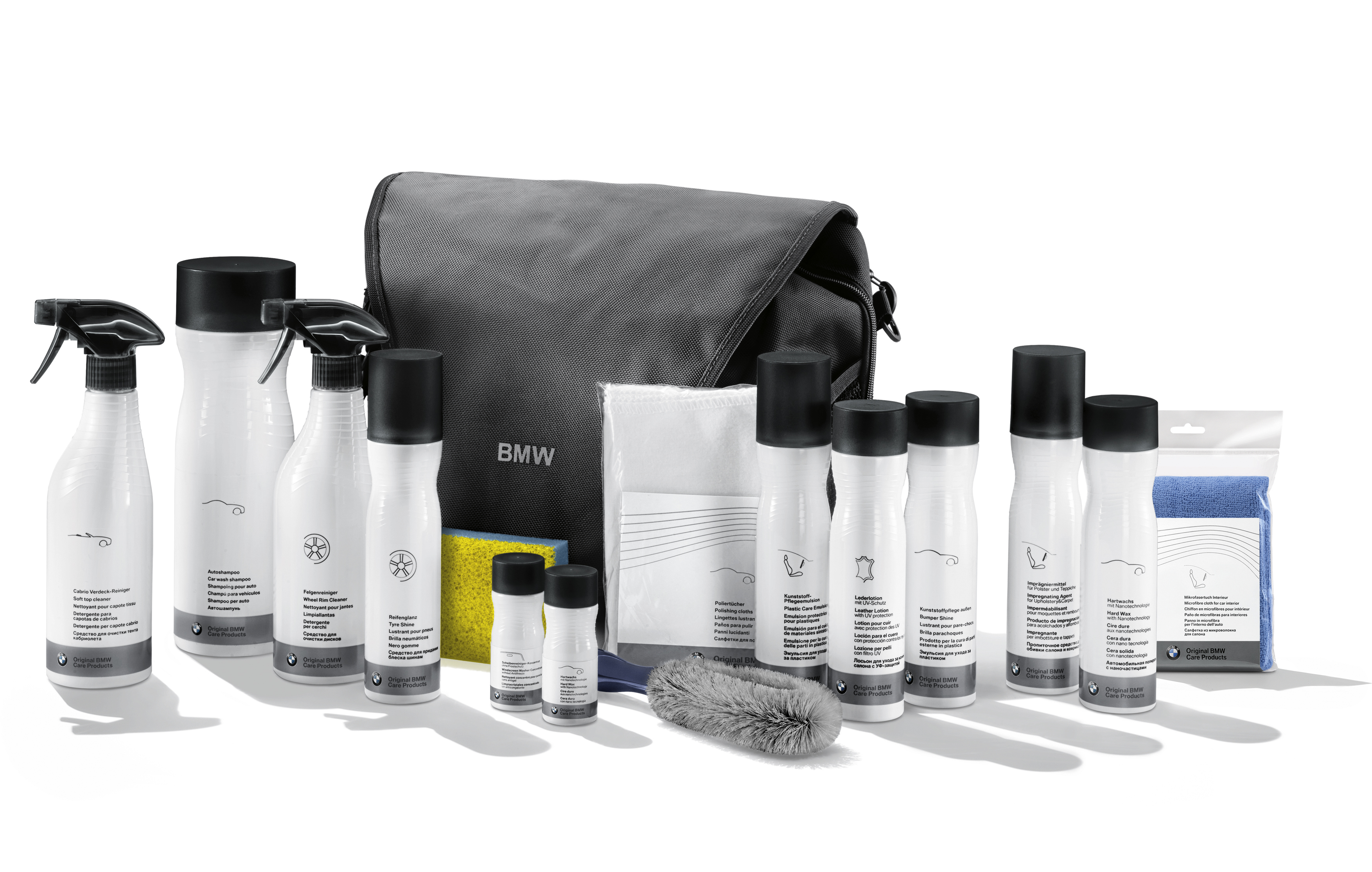 Original BMW Care Products - Seal & Protect Set EU, incl. Soft top cleaner (500ml), Car Shampoo (1000ml), Wheel Rim Cleaner (500ml), Tyre Shine (250ml), Windscreen Cleaner Concentrate (50ml), Hard Wax with Nanotechnology (50ml), Plastic Care Emulsion (250ml), Leather care kit with UV protection (250ml), Bumper shine (250ml), Impregnating agent for upholstery and carpets (250ml), Hard Wax with Nanotechnology (250ml), Polishing Cloth, Sponge for Plastic care Emulsion, Wheel Rim brushes (06/2016).