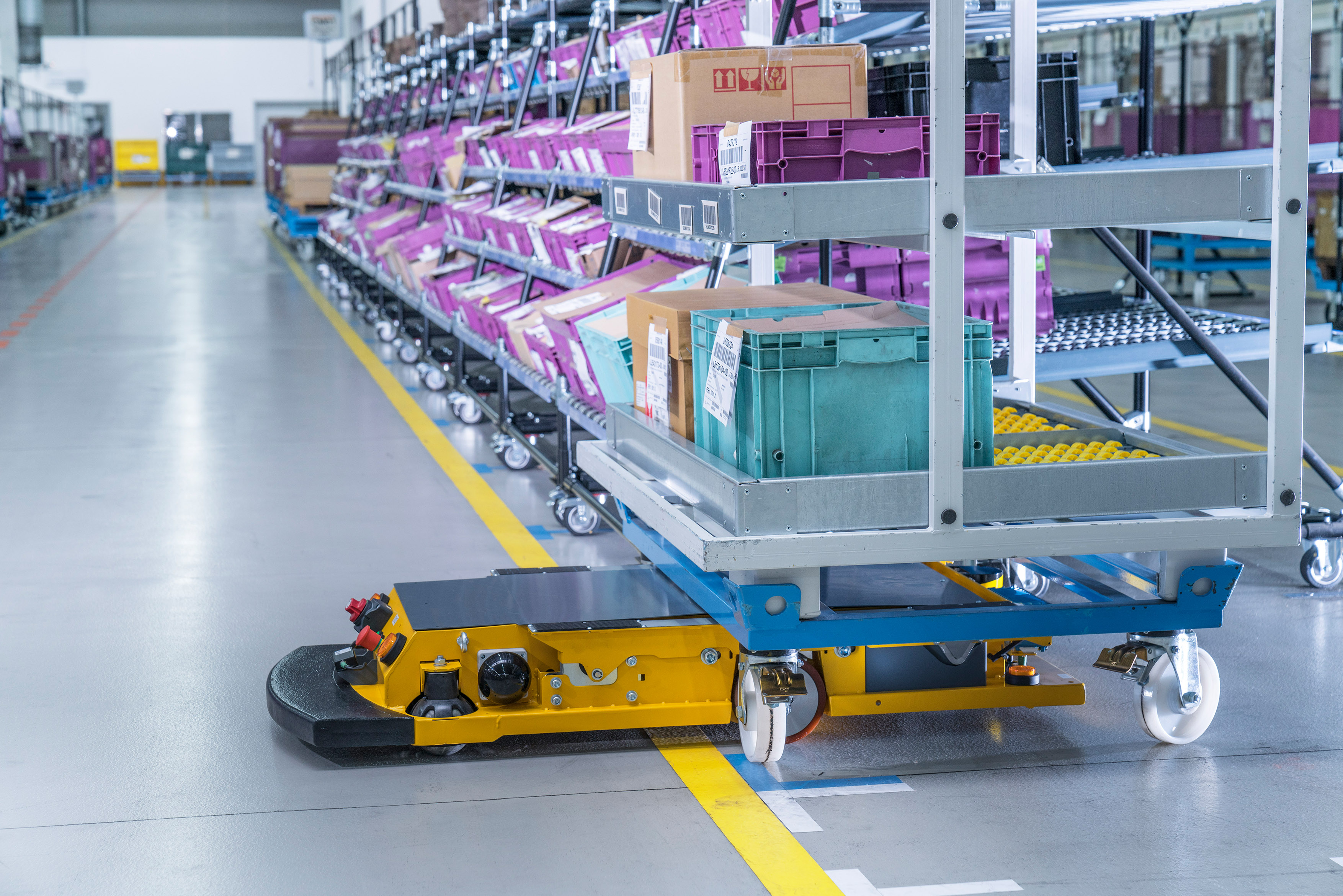 Smart Transport Robot carrying roller containers through the logistics hall at BMW Group Plant Wackersdorf (11/2016)