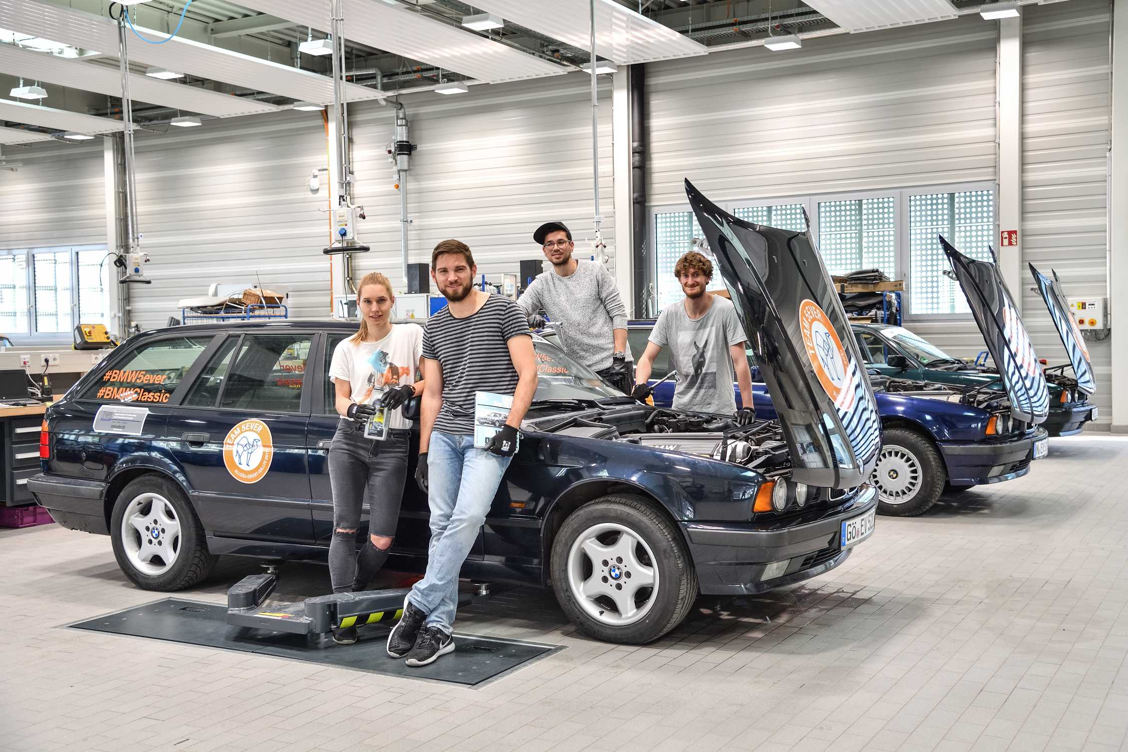 Preparation for the Allgäu Orient Rally 2017: A BMW 520i touring (E34) from the “5ever” Team in the workshop at BMW Group Classic (05/2017).