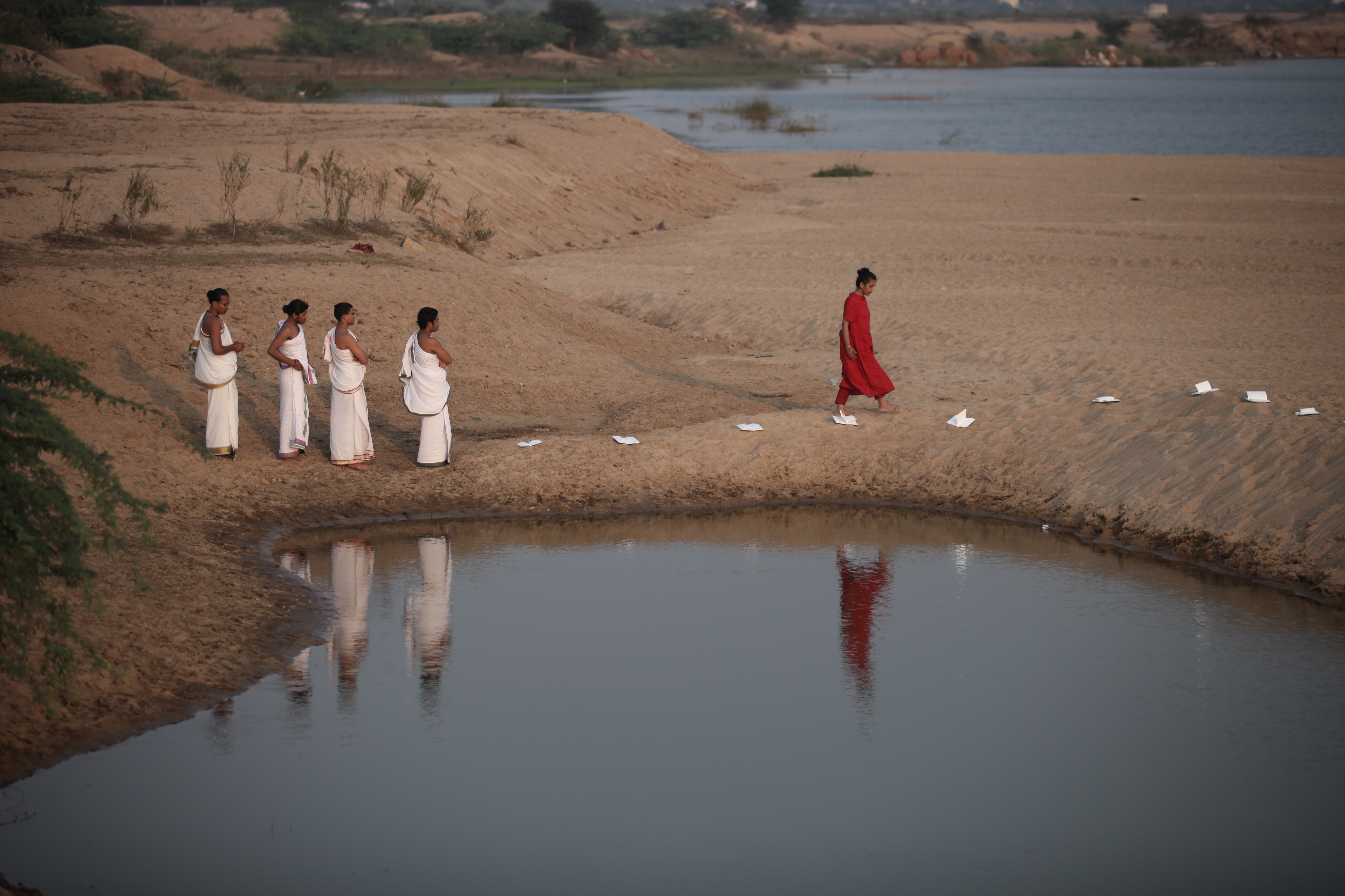 The Artist, Astha Butail in South India, At the the Palar River, Chengelpet, working with books with four Ghanapatis ( memory experts, who have learnt the entire hymns in 8 different memory patterns) Date : 4th january 2018. Photo: Astha Butail. (03/2018)