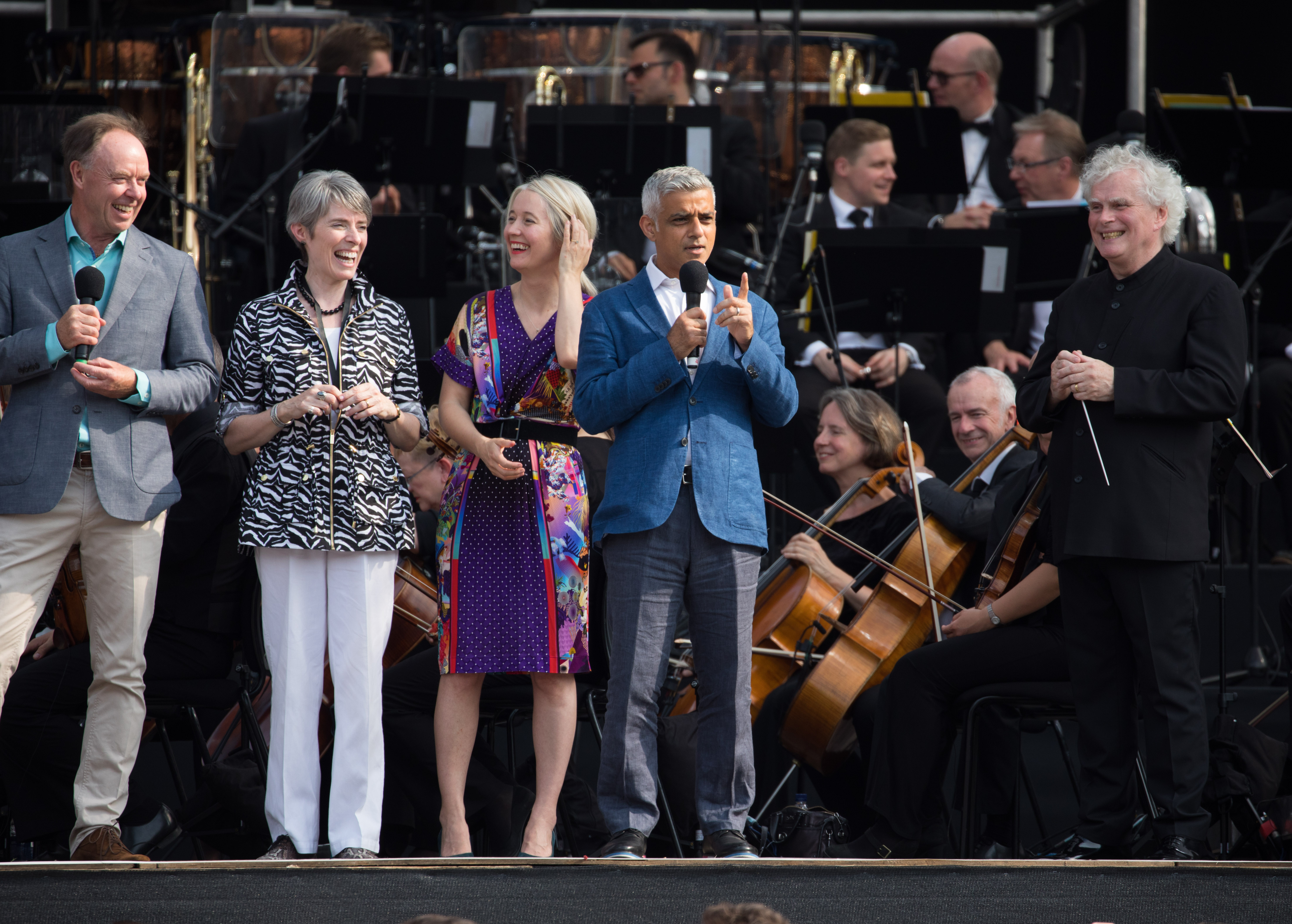 BMW Classics 2018 on Trafalgar Square in London: Ian Robertson, Kathryn McDowell (Managing Director, London Symphony Orchestra), Justine Simons (Deputy Mayor for Culture and Creative Industries, GLA), Sadiq Khan (Mayor of London) and Sir Simon Rattle (Music Director, London Symphony Orchestra). (c) London Symphony Orchestra and BMW AG(07/2018)