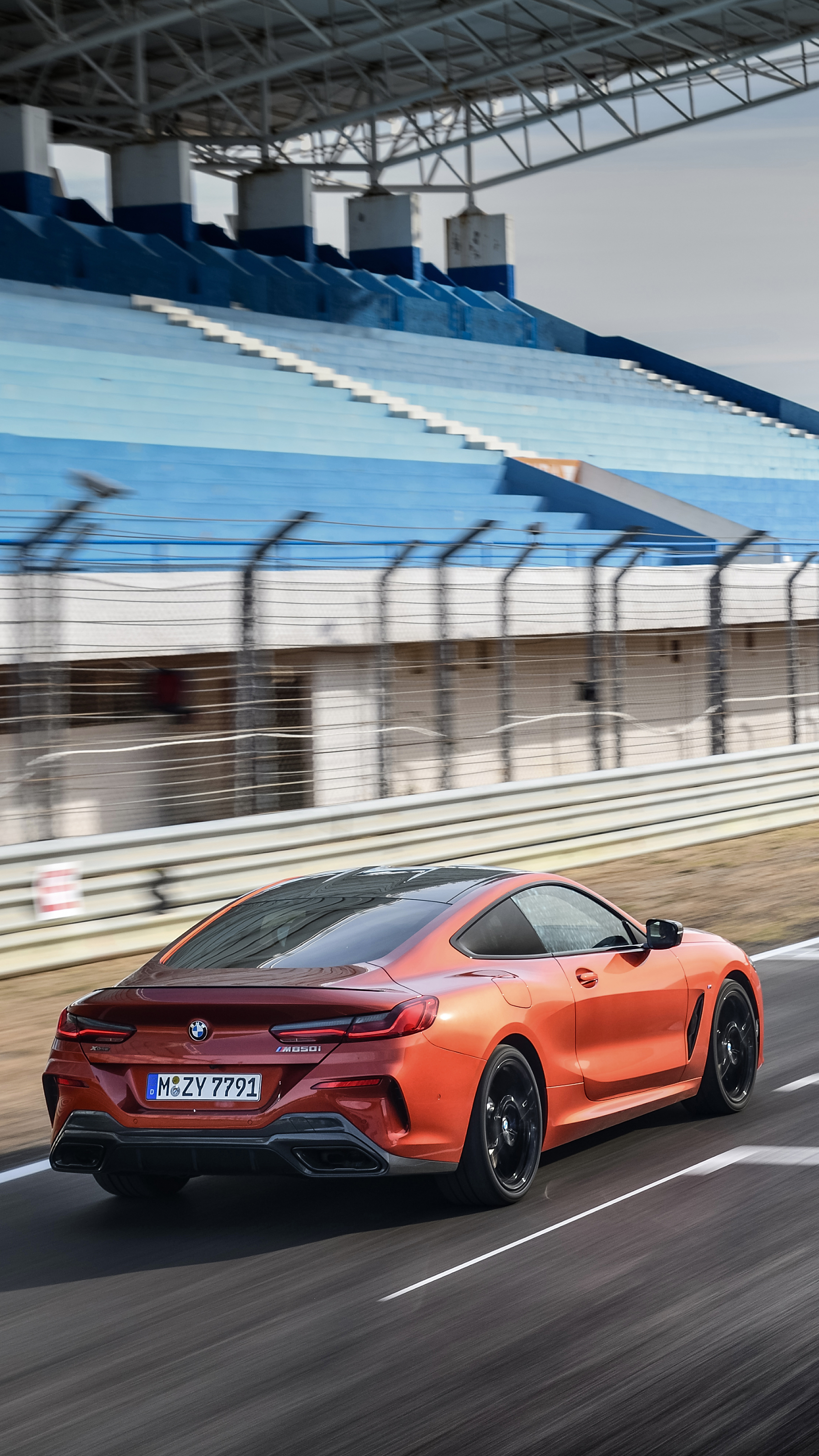 The new BMW M850i xDrive Coupe in colour Sunset Orange and 20" M light alloy wheels Y-spoke style 728 M Jet Black - Estoril / Lissabon, Racetrack (10/2018)