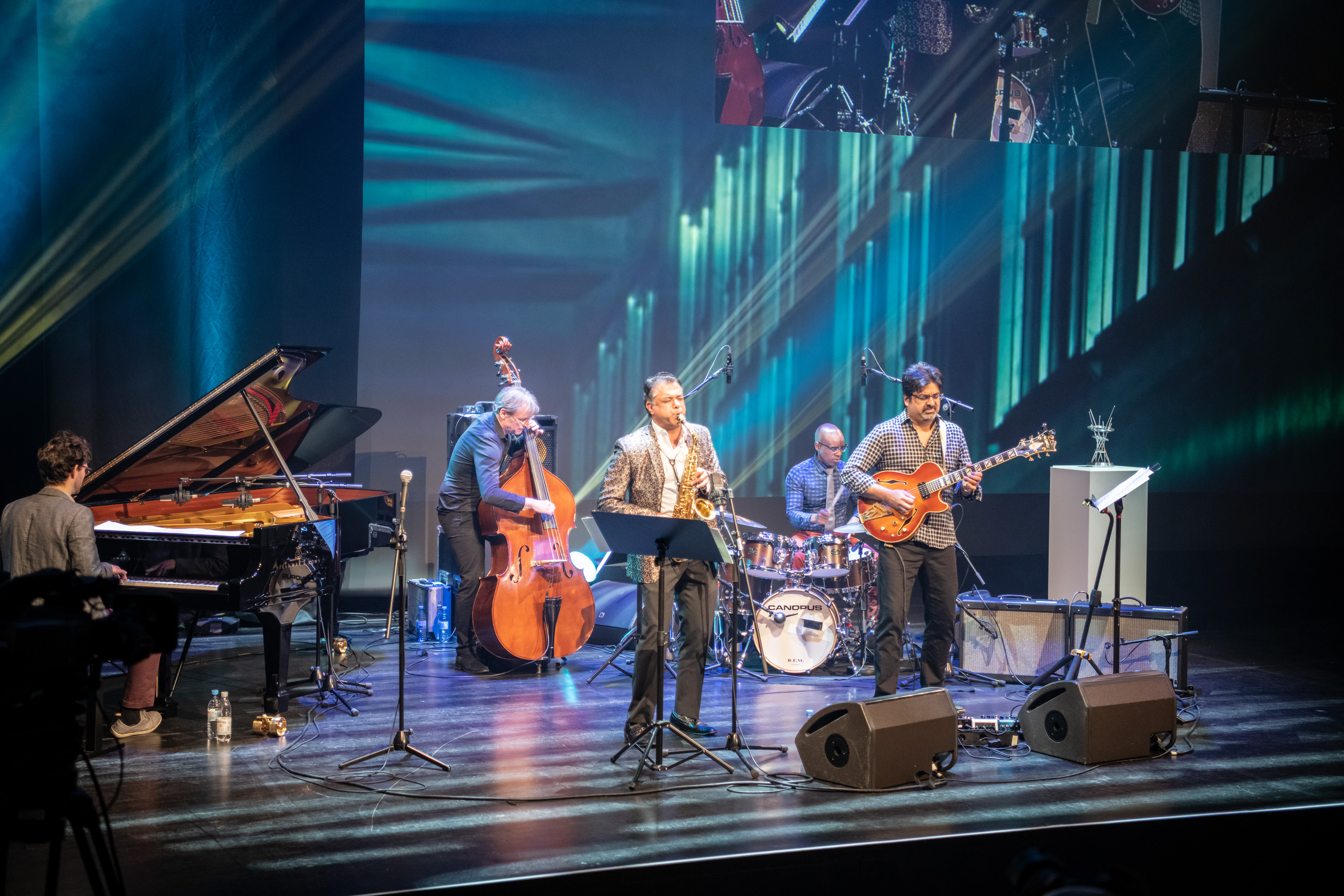The runner-up of the BMW Welt Jazz Award 2019: Rudresh Mahanthappa Quintet, f.l.t.r.: Bobby Avey (piano), Rudresh Mahanthappa (saxophone), Francois Moutin (bass), Rez Abbasi (guitar) and Rudy Royston (drums). (05/2019)