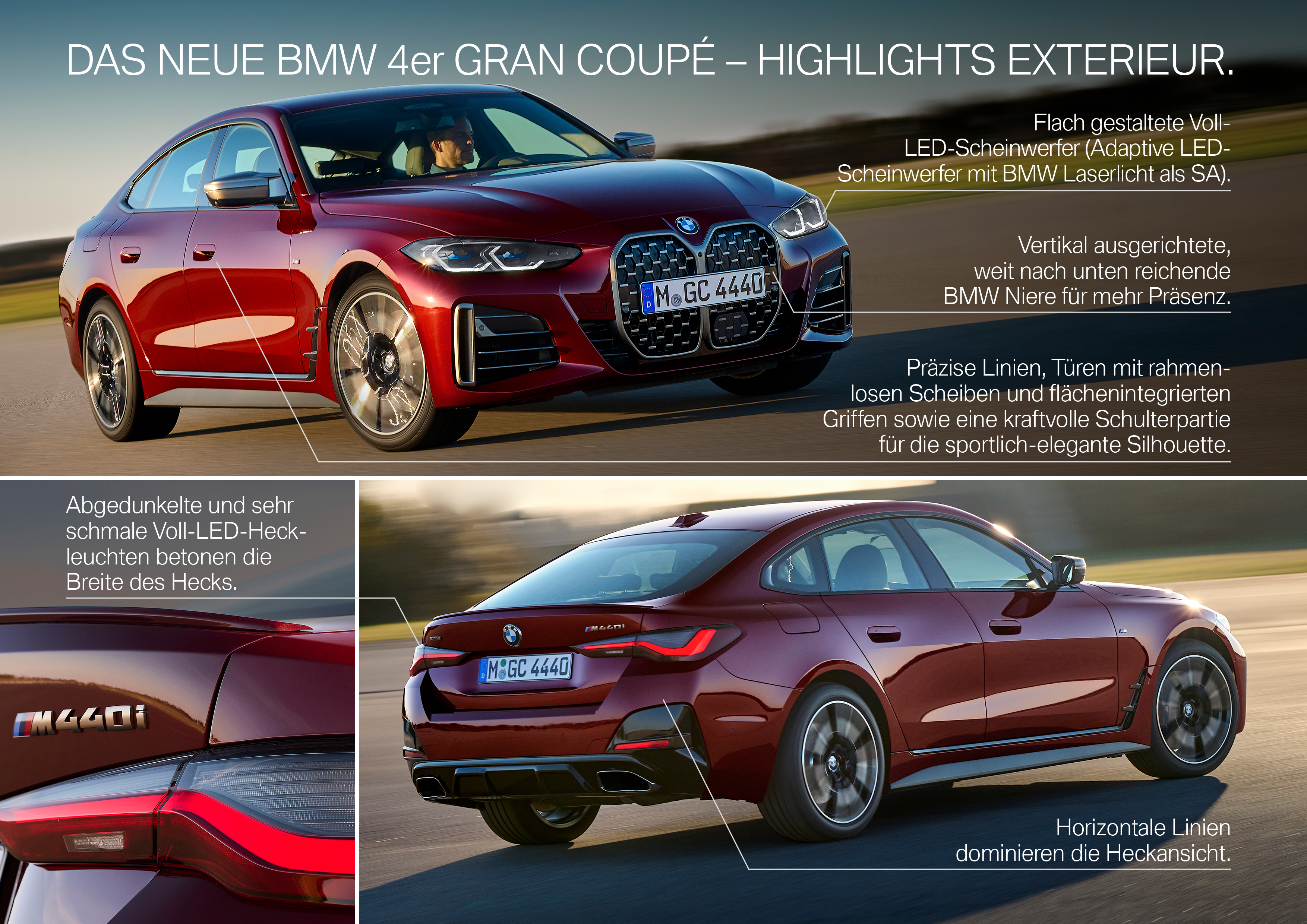 The all-new BMW M440i xDrive Gran Coupé, Aventurine Red (Individual), Rim 19“ Styling 861M (06/2021).