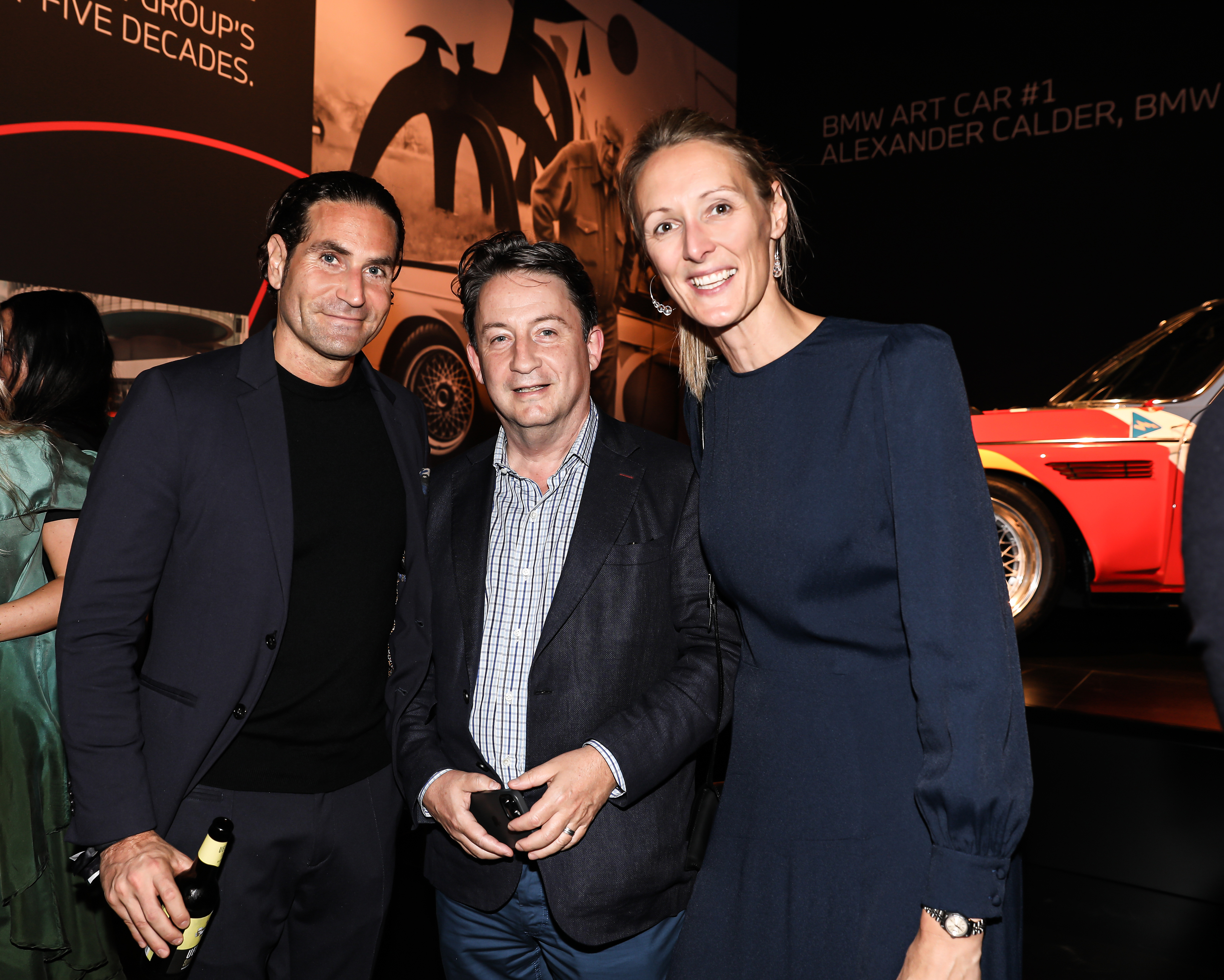 Celebrating 50 Years of BMW Group Cultural Engagement at Kunstmuseum Basel on September 21, 2021: (f.l.t.r.) Dr. Alexander Kotouc (Head of BMW Group Experiential Marketing), Christiane Pyka (Project Lead BMW Group Arts & Design Cooperations) and Andras Szanto (Art Consultant) in front of the BMW Art Car by Alexander Calder, BMW 3.0 CSL, 1975. © Sara Barth and BMW AG (09/2021)