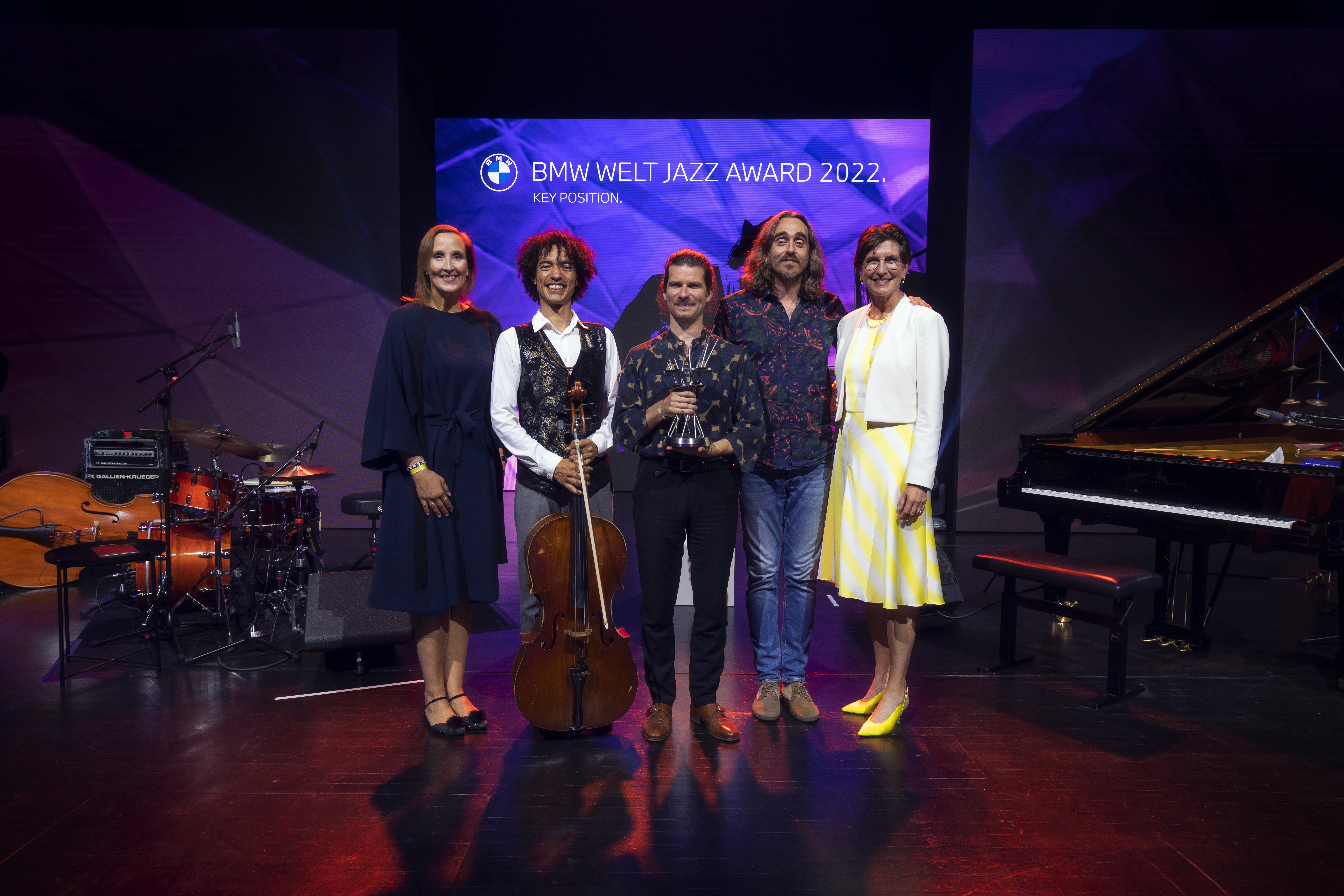 Final concert of the BMW Welt Jazz Award 2022, f.l.t.r.: Tatjana Bister (Head of BMW Welt), Martín Meléndez (cello), Marco Mezquida (piano), Aleix Tobias (drums), Ilka Horstmeier (Member of the Board of Management of BMW AG, People and Real Estate, Labour Relations Director). Photo: Enes Kucevic.