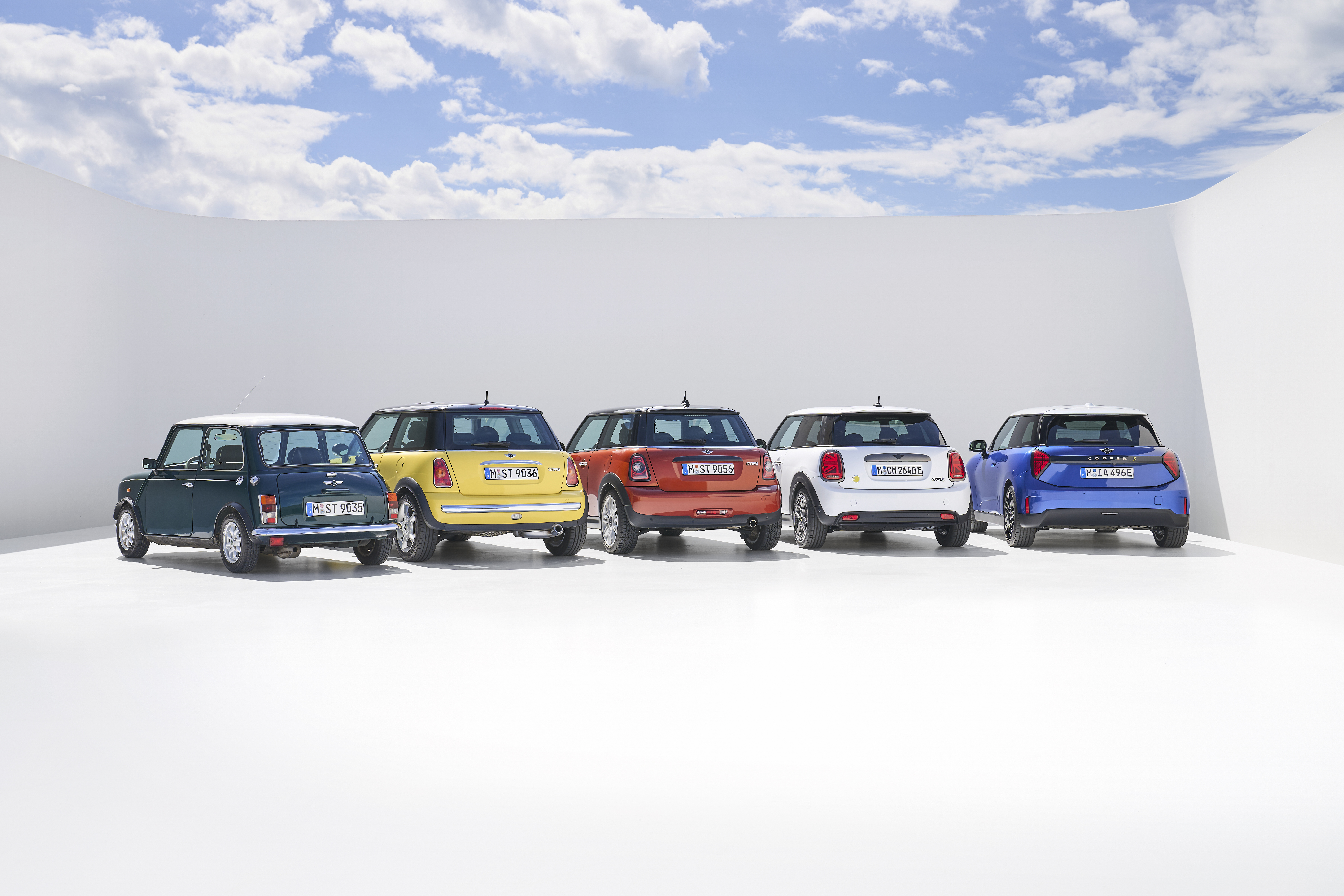 MINI History Shot: Mini Cooper Gen 1 Mk VII, MINI Cooper Gen 2 Mk I, MINI Cooper Gen 3 Mk II, MINI Cooper Gen 4 Mk III, MINI Cooper SE (09/2023).