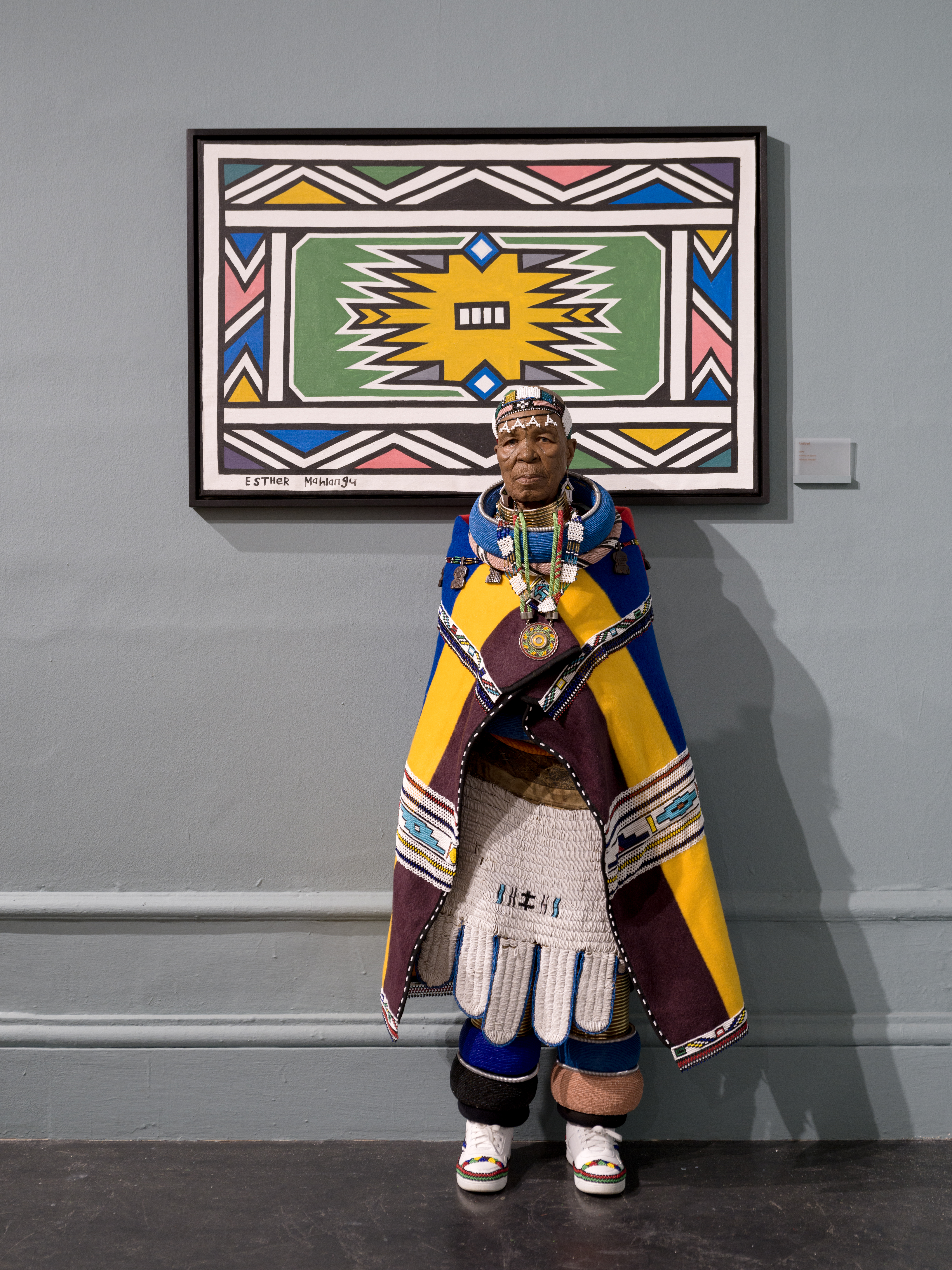 Artist Esther Mahlangu at the exhibition "Then I Knew I Was Good at Painting": Esther Mahlangu. A Retrospective, Iziko South African National Gallery, ...