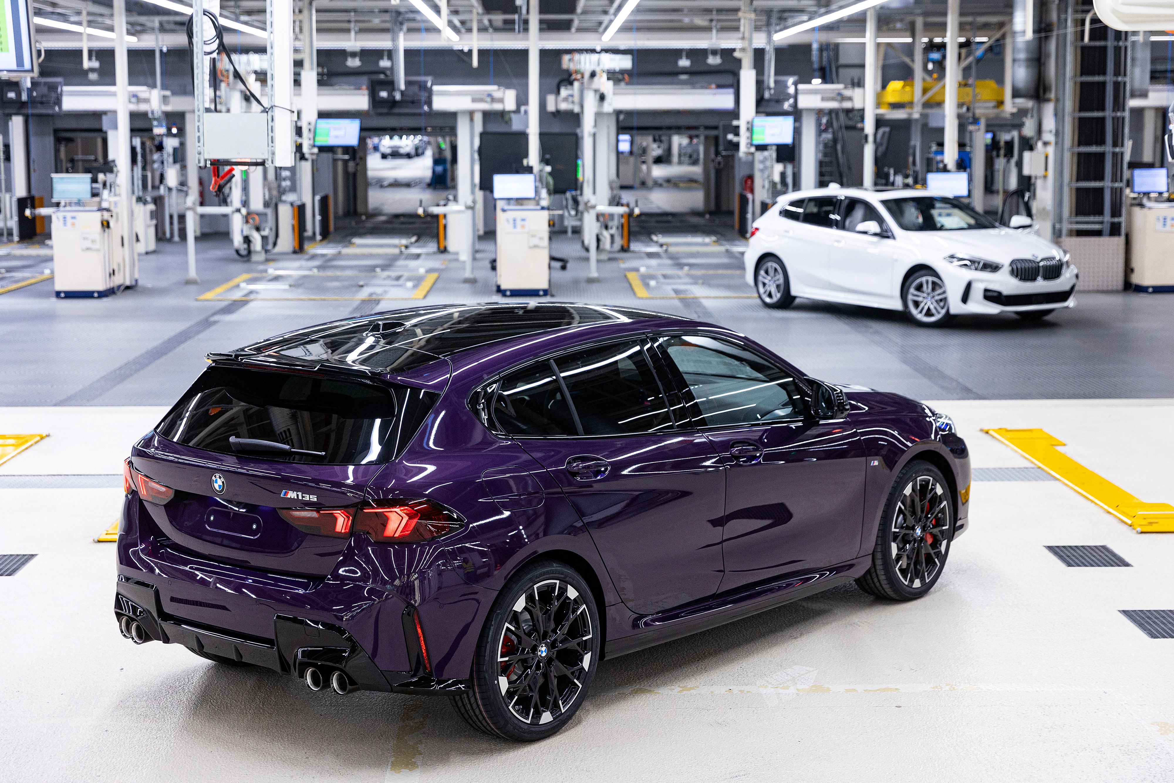 Production of a new BMW M135 xDrive in Thundernight Metallic with a contrast roof, at BMW Group Plant Leipzig (07/2024)