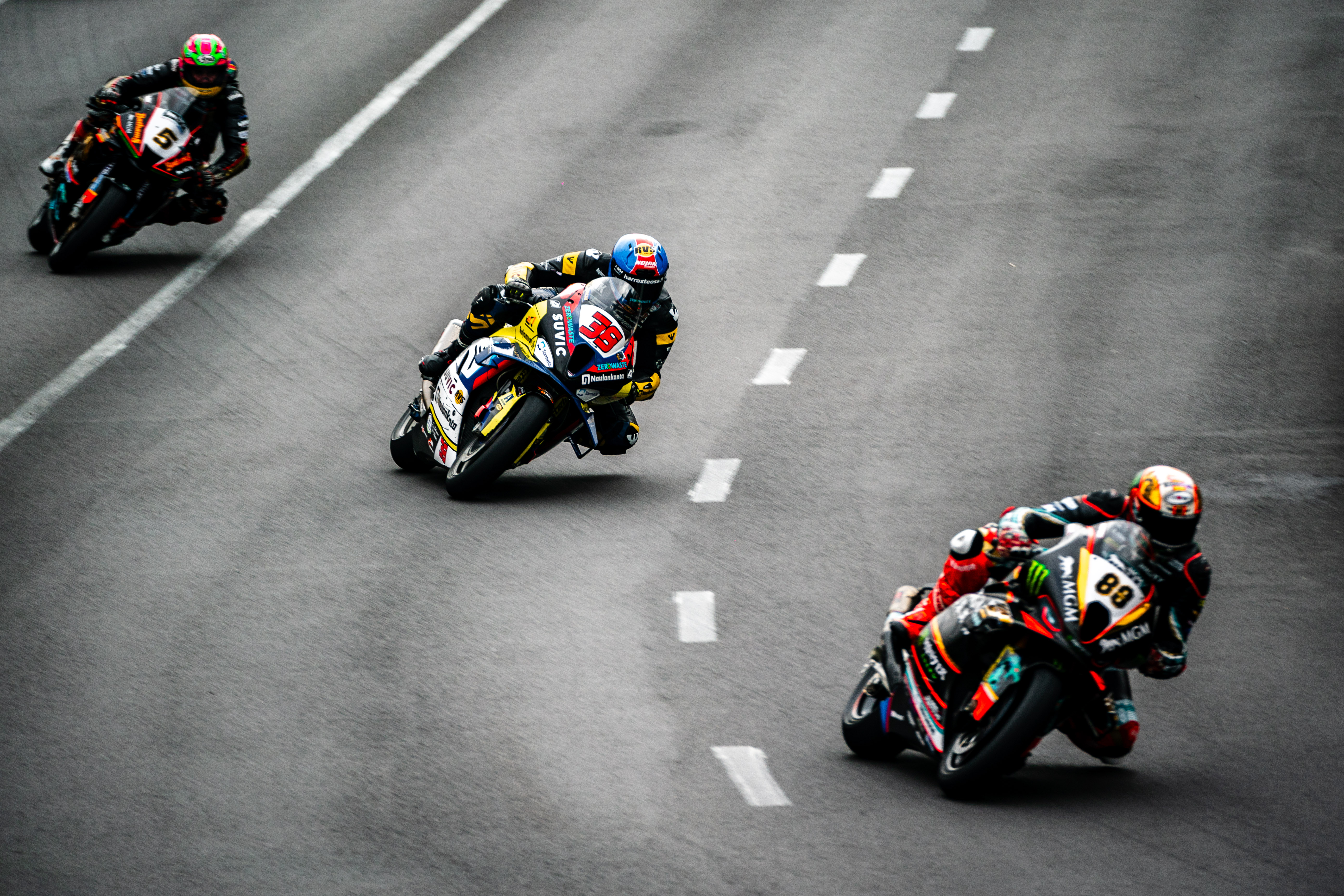 Macau (MAC), 13th to 17th November 2024. BMW Motorrad Motorsport, Road Racing, 56th Macau Motorcycle Grand Prix, FHO Racing BMW Motorrad, #88 BMW M 1000 RR, Peter Hickman (GBR), 38 Motorsport by Penz13 Racing, #38 BMW M 1000 RR, Erno Kostamo (FIN), FHO Racing, #5 BMW M 1000 RR, Craig Neve (GBR).