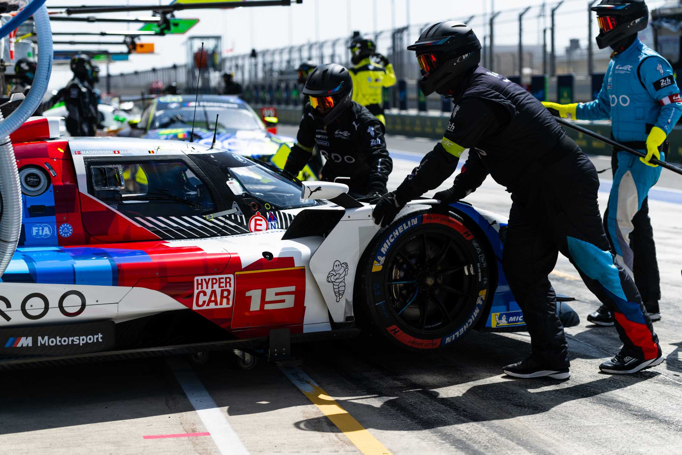 Lusail (QAT), 21st to 22nd February 2025. BMW M Motorsport, FIA World Endurance Championship, FIA WEC, Official Prologue, Qatar, BMW M Team WRT, Hypercar, LMDh, hybrid, #15 BMW M Hybrid V8, Kevin Magnussen, Raffaele Marciello, Dries Vanthoor.