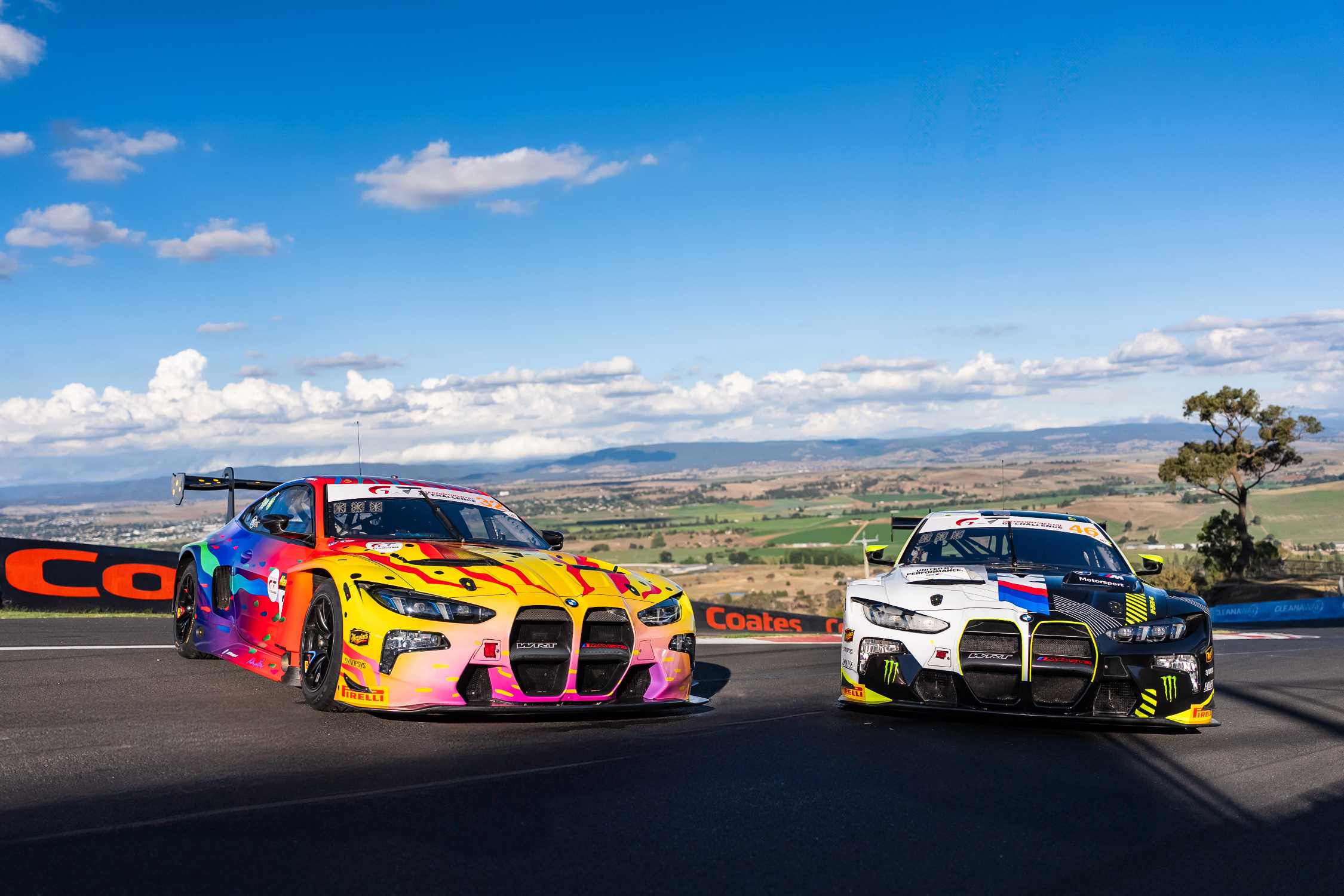 Bathurst (AUS), 11-15 February 2025. Intercontinental GT Challenge, IGTC, Bathurst 12 Hour, Mount Panorama Circuit, Team WRT, #32 BMW M4 GT3 EVO, Ken Done, 1989 BMW M3 Art Car tribute, livery, design, Kelvin van der Linde, Jordan Pepper, Charles Weerts, #46 BMW M4 GT3 EVO, Valentino Rossi, Raffaele Marciello, Augusto Farfus.