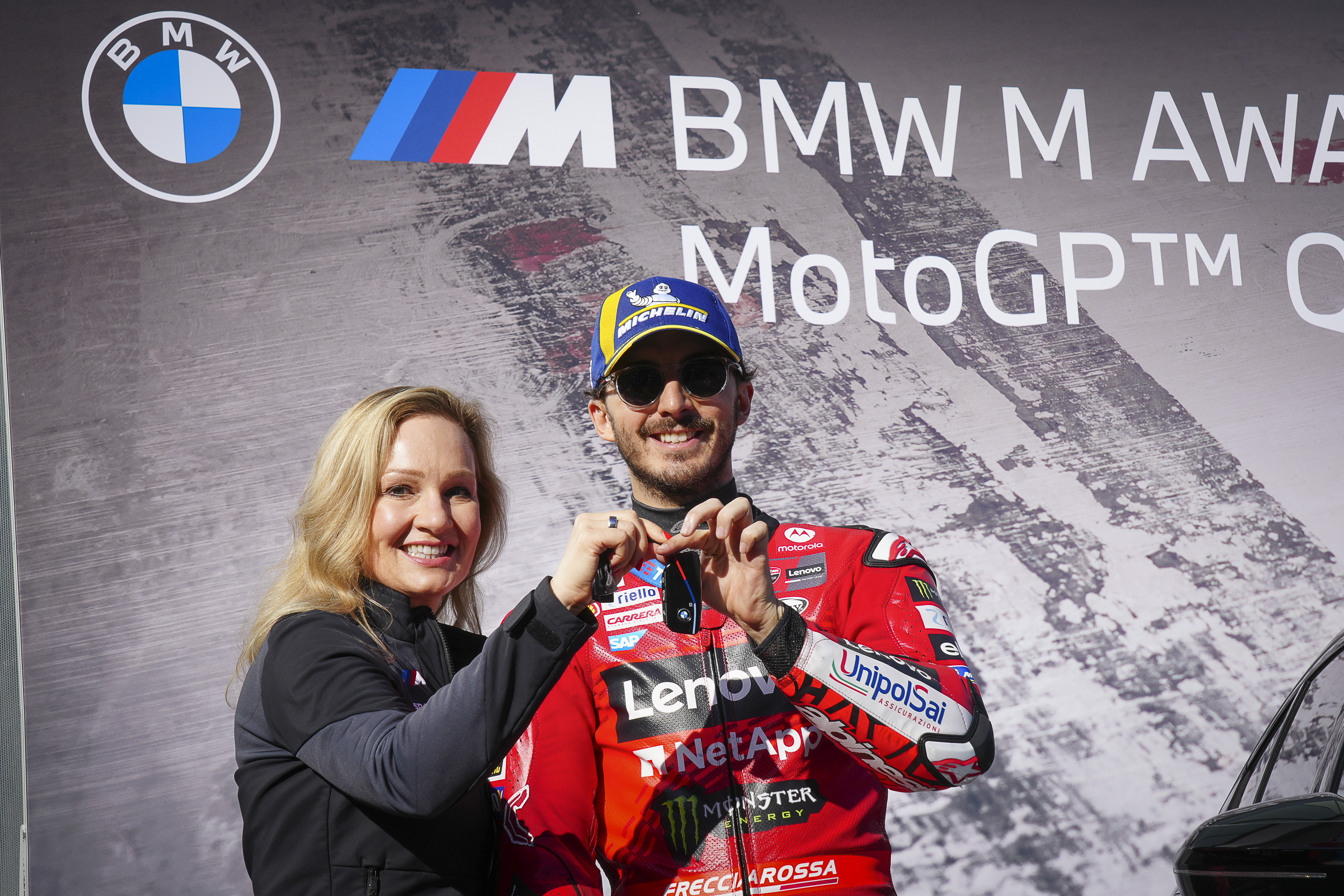 Barcelona (ESP), 16th November 2024. BMW M GmbH, Official Car of MotoGP™, BMW M Award 2024, MotoGP™. Sylvia Neubauer, Vice President Customer, Brand and Sales at BMW M GmbH, winner Francesco Bagnaia (ITA), winner's car BMW M5.