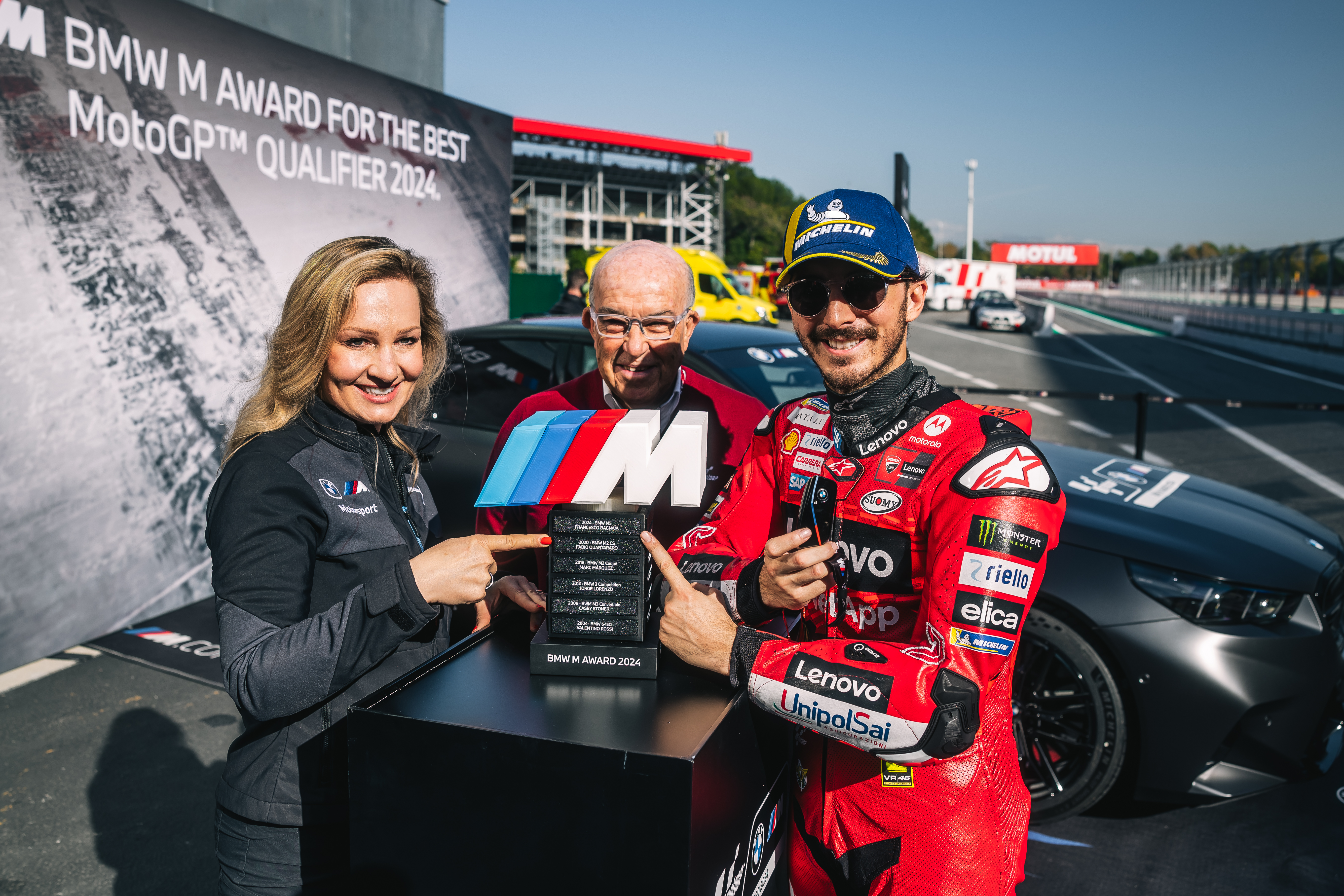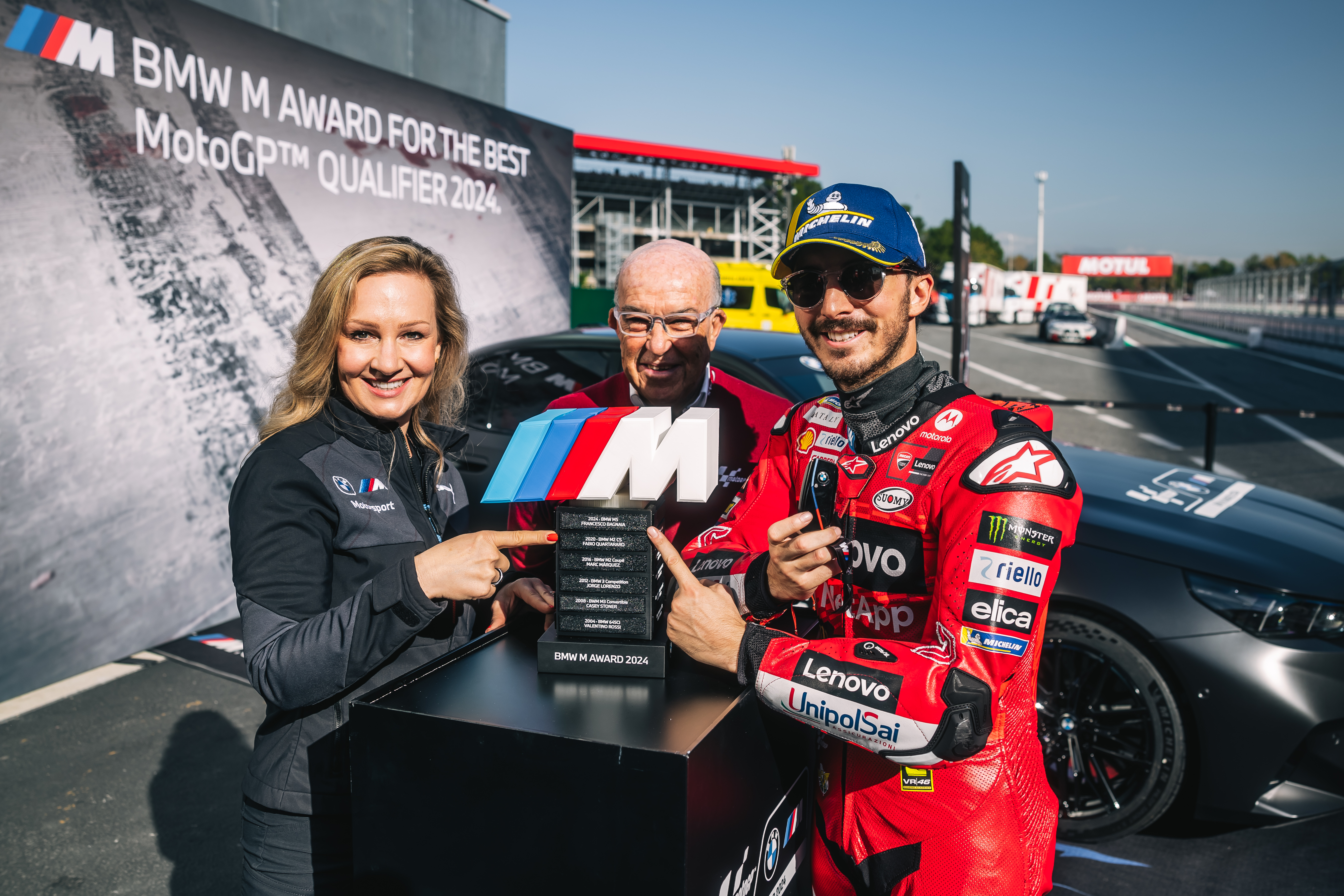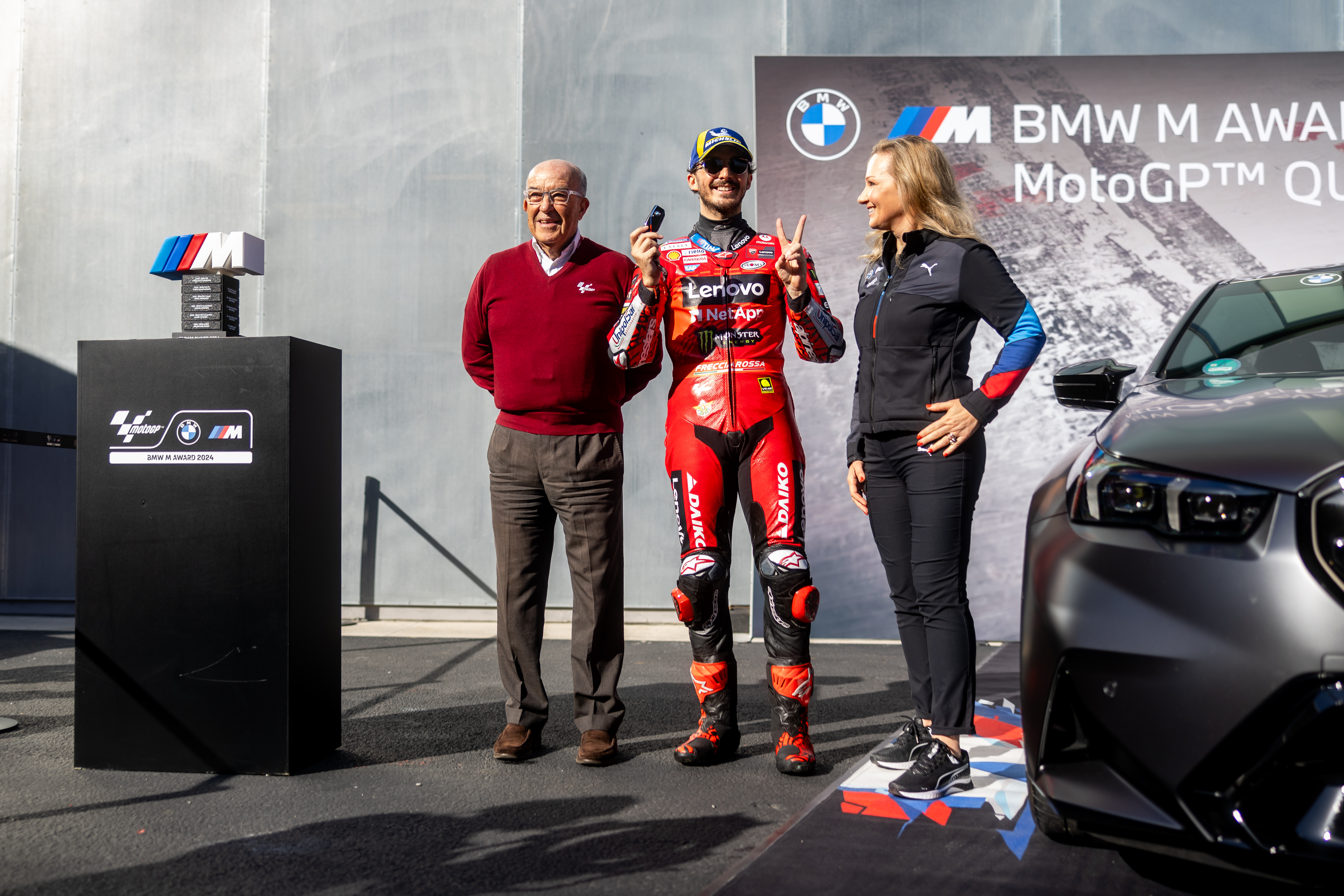 Barcelona (ESP), 16th November 2024. BMW M GmbH, Official Car of MotoGP™, BMW M Award 2024, MotoGP™. Sylvia Neubauer, Vice President Customer, Brand and Sales at BMW M GmbH, Carmelo Ezpeleta, CEO of Dorna Sports, winner Francesco Bagnaia (ITA), winner's car BMW M5.