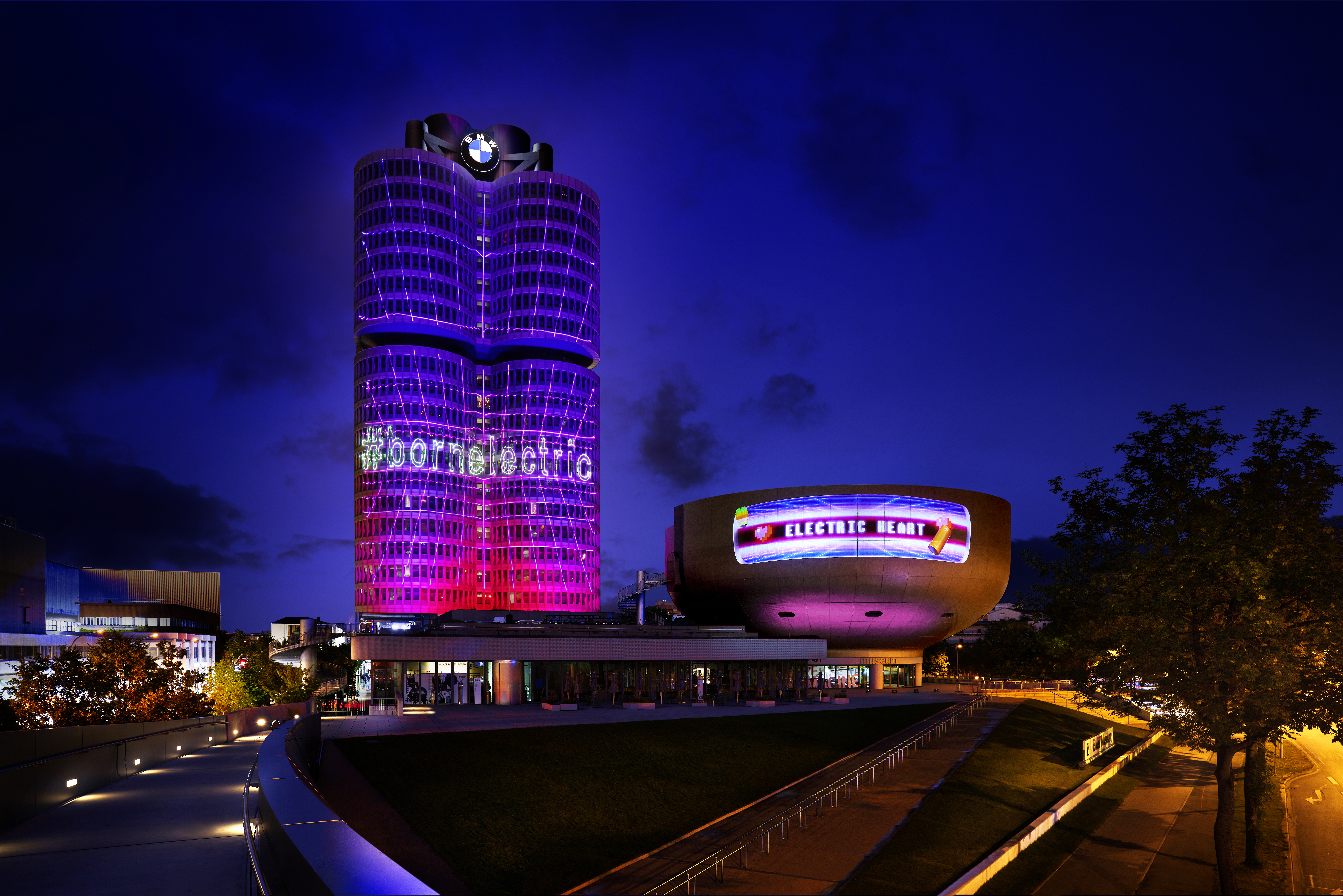 Illumination BMW Headquarters and BMW Museum - BMW Group welcomes competitors and guests to the 2022 European Championships in Munich.